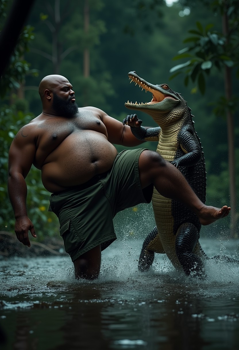 A really fat bald African-American man wearing fatigue shorts, ((fighting an alligator)), ((Roundhouse kick to the snout)), swamp setting, night-time, water splash, dark skin, beard, cinematic lighting, gator flying back from kick, (((((KICK))))), Photorealistic, Masterpiece, 4k, Highest Quality, Realistic,