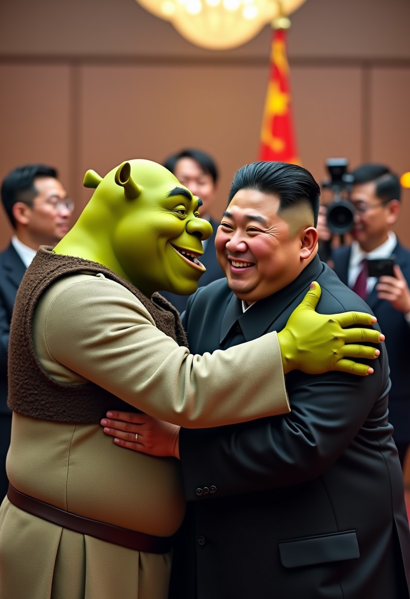 Photorealistic picture of Shrek and Kim Jong Un embracing each other, press conference background, media, smiling, cameras, extremely detailed, politics