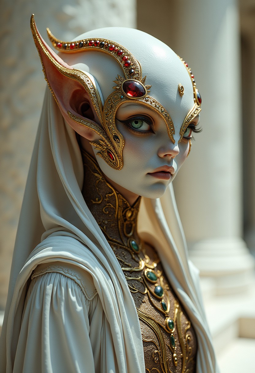 Professional photo, turned slightly away, the style of dark white and light bronze, gold filigree, fierce alien priest on an alien planet, adorned with garnet and bloodstone gemstones, standing in ancient white marble temple, by Brian Froud and Heather Theurer, extremely detailed head and face, very realistic and symmetrical eyes, emerald green eyes, (eye contact with viewer), hyper detailed, hyper quality, artstation award winner, Epic realism, meticulous masterpiece,
