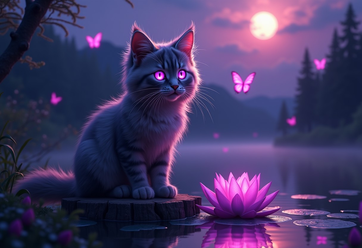 Masterpiece, 4k, 8k, high quality, highly detailed, A MaineCoon kitten with glowing purple eyes, long fluffy ears, detailed colorful fur, long thick whiskers, glowing whiskers, sitting on a stump in the middle of an enchanted lake, ((enchanted forest setting)), ((magical purple lights)), glowing pink butterflies in background, amazing dark skyline, night time, digital concept art, glowing lotus flower in lake,