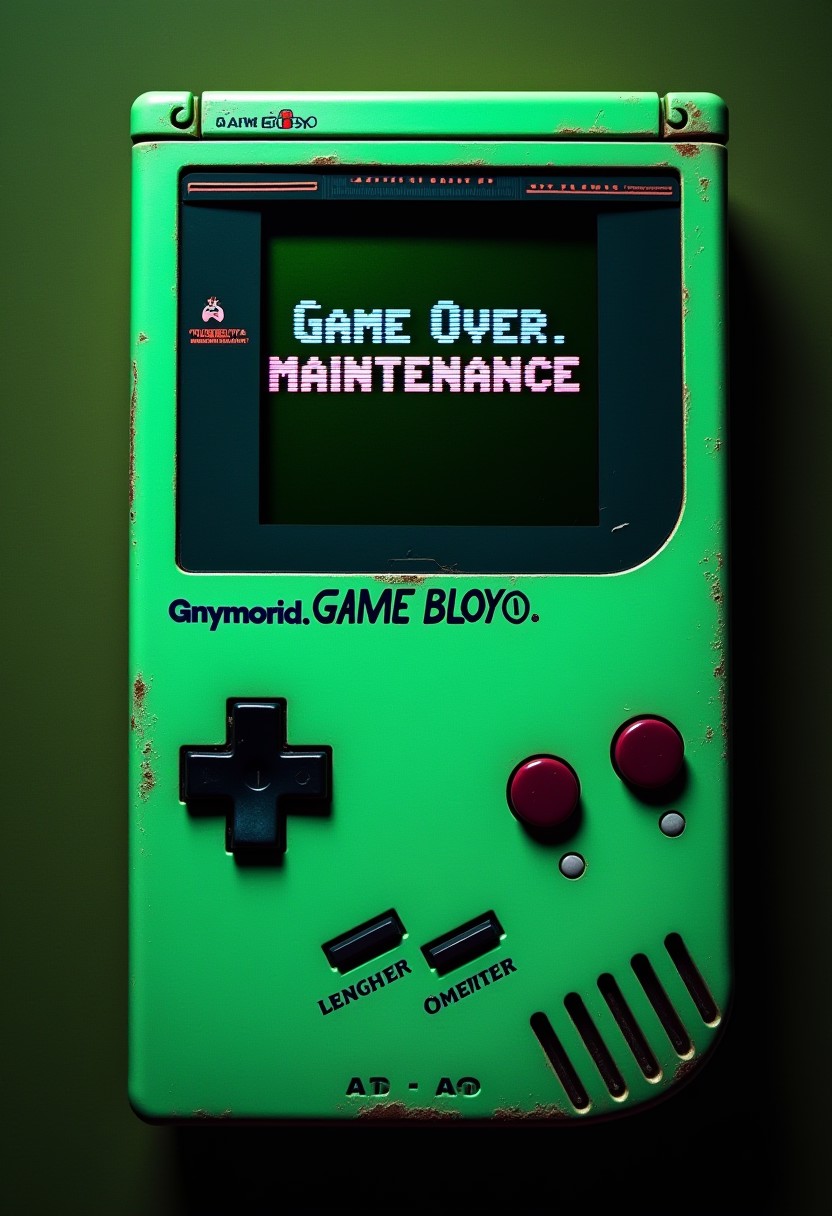 A gameboy with a glitched 8-bit green and black screen. The game boy looks old with a few small cracks, screen has a game font "Game Over. Maintenance" screen in the middle with a few 8-bit glitchy graphics surrounding it.