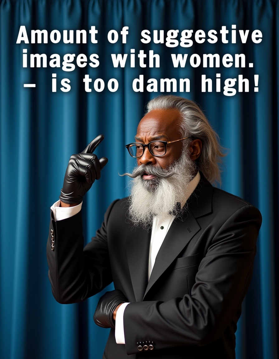 at the top of image floating text "Amount of suggestive images with women" wrtten with huge white letters , at the bottom of image floating text "is too damn high!" wrtten with huge white letters , text is clearly visible , old african black man with gray long hair and fancy mustache and beard wearing glasses and classy suit and black gloves, his right hand is raised, he's irritated , blue curtain as background