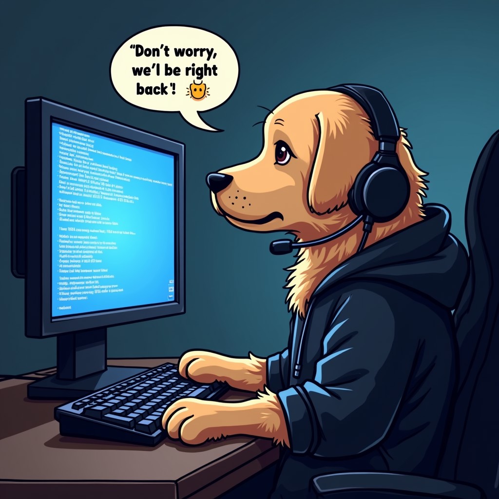 Portrait of a cute golden dog sitting in front of a computer screen, paws on keyboard, wearing a black hoodie and a gaming headset. The computer screen is a blue screen of death showing white unintelligible error text and an ascii frown face : ( . There is a text bubble coming from the dog's head, it says "Don't worry, we'll be right back"