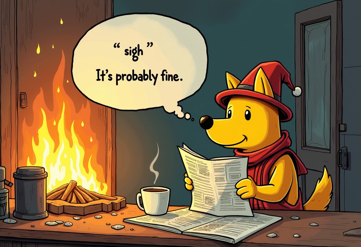 a yellow dog with a small hat and a newspaper drinks coffee in a burning house, distracted from reading the newspaper, a monologue bubble with the text "*sigh* It's probably fine"