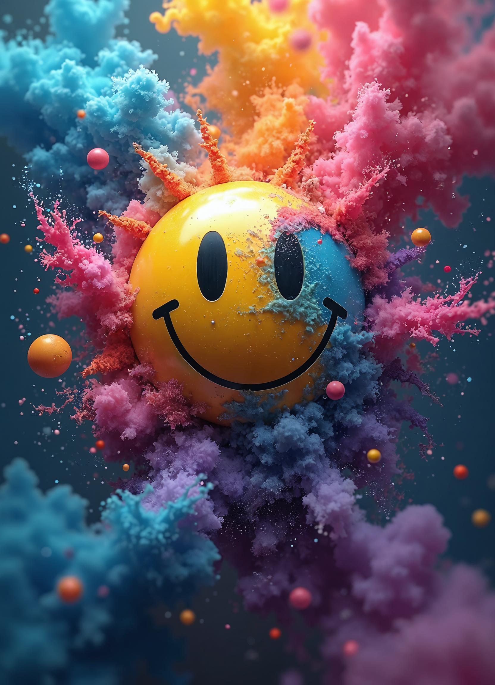 Surrealist explosion of vibrant colors centered around a cosmic smiley face. Swirling vortex of neon hues - electric blue, fuchsia, vivid yellow, and deep purple - create a psychedelic backdrop. Billowing clouds of color reminiscent of nebulae or underwater ink drops engulf the scene. The smiley face emerges from this chromatic chaos, its surface a shimmering, iridescent canvas reflecting the surrounding spectrum. Textures range from vaporous mists to crystalline shards, with bursts of tiny geometric confetti scattering across the image. Liquid splashes and drips of saturated pigments add a sense of dynamic motion. Glowing particles and sparks dance throughout, suggesting cosmic dust or bioluminescent organisms. The contrast between the simple, iconic smiley face and the complex, swirling environment creates a dreamlike juxtaposition. The eyes of the smiley face appear as black voids, portals into an unknown dimension amidst the riot of color. Overall, the image evokes a sense of joyful chaos, as if witnessing the birth of a universe through a kaleidoscope of pure emotion and energy.