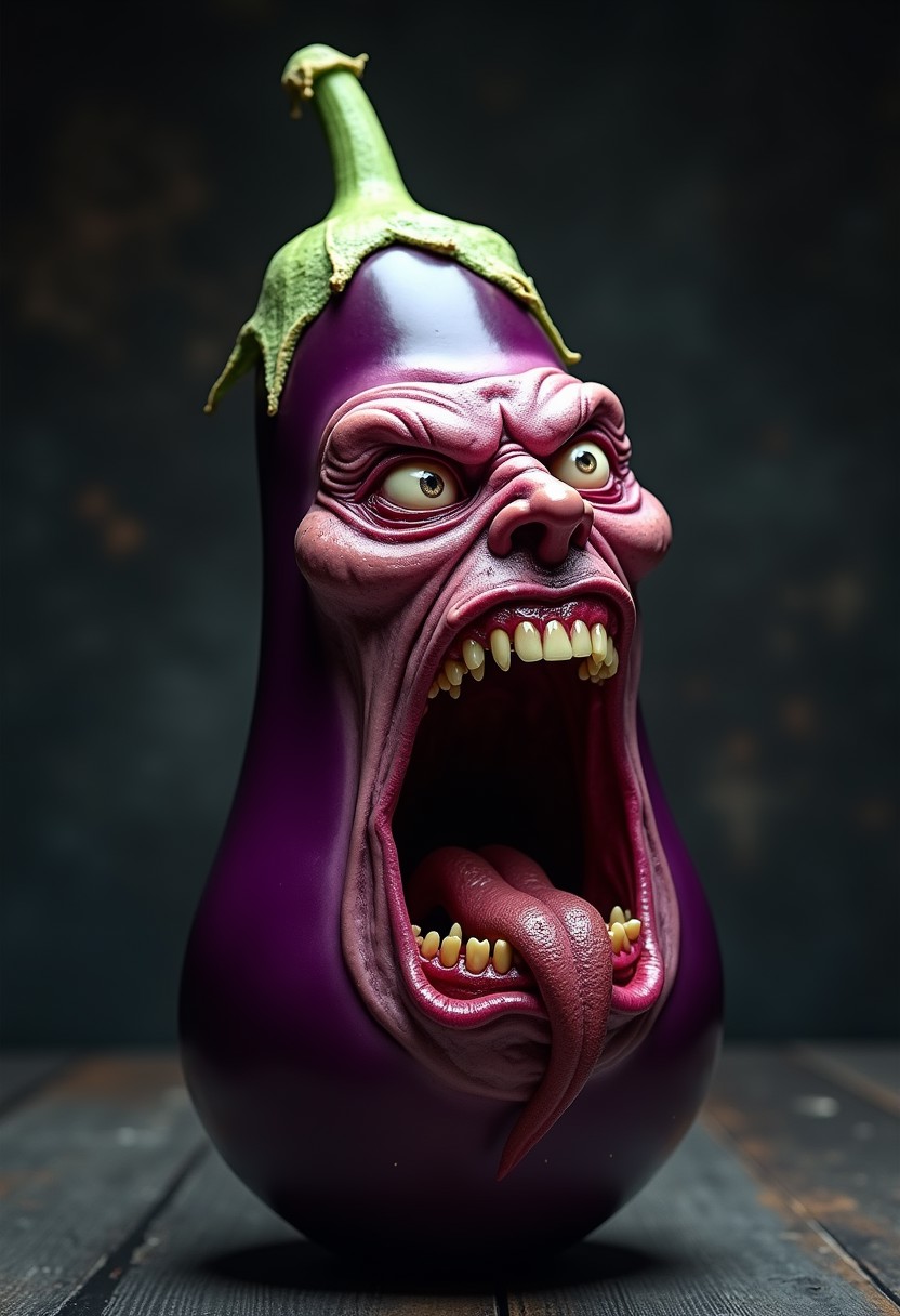 Hyperrealistic eggplant with a grotesquely anthropomorphic face, screaming in intense rage or agony. Smooth, oblong shape with glossy purple skin, transitioning seamlessly into wrinkled, flesh-like features. Eyes bulge outward, bloodshot and strained, with pale, watery flesh forming eerie eye sockets. Brow deeply furrowed, creating harsh lines across the eggplant's surface. Nose scrunched and flared, nostrils clearly visible. Mouth stretched impossibly wide, revealing rows of human-like teeth and a moist, glistening tongue. Lips pulled back in a snarl, exposing gums. Cheeks contorted, emphasizing the screaming expression. Skin pores and fine hairs visible on the face portion, blending into the smooth, shiny eggplant texture with its slight dimples and curves. Vivid purple coloration with subtle variations in tone, highlighting the vegetable's glossy surface. Harsh lighting from above casts dramatic shadows, accentuating the three-dimensional quality and the grotesque facial features. Background is a neutral grey gradient, focusing attention on the surreal, nightmarish eggplant creature.
