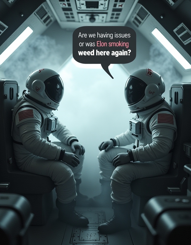 astronauts sitting near eachother in a cockpit filled with thick smoke, one of them says in a speech bubble "Are we having issues or was Elon smoking weed here again?" with big font size, SpaceX logo