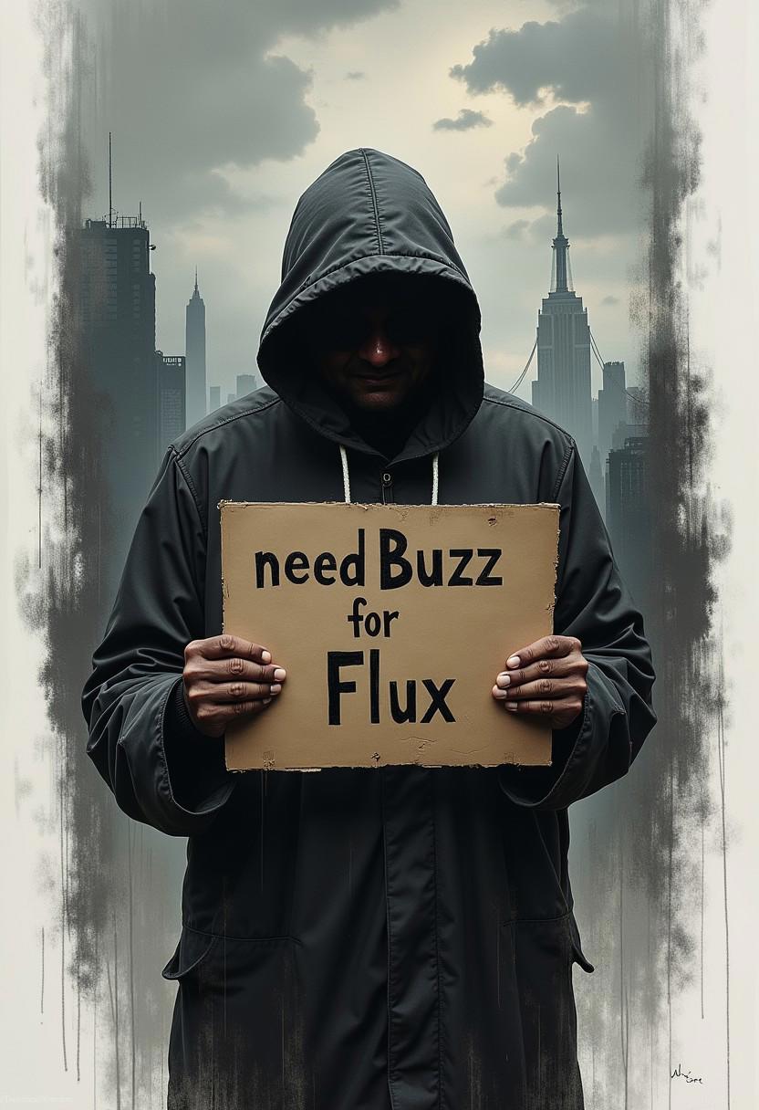 A man begging for money, holding a cardboard saying "need Buzz for Flux" crying, The background is an enigmatic black void, with the inclusion of distant cityscape buildings adding depth to the scene. The somber gray sky, adorned with ethereal clouds, enhances the intensity of the composition. The artwork is masterfully signed by the incredibly talented artist, Wittje, in bold Arial font., simple white background,