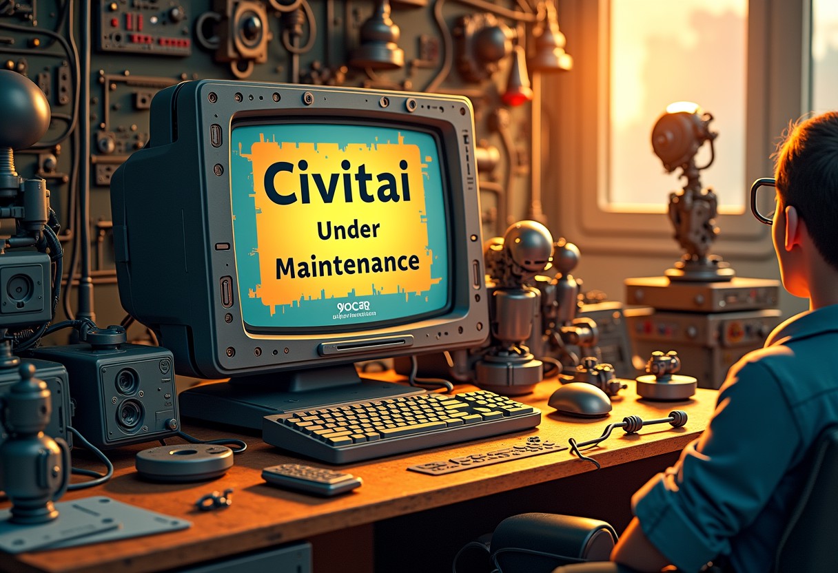 A whimsical 'Civitai Under Maintenance' sign on a futuristic computer terminal, surrounded by wires, gears, and tools, with a few robots and coding sprites tinkering in the background, amidst a warm, golden glow of repair and rejuvenation.