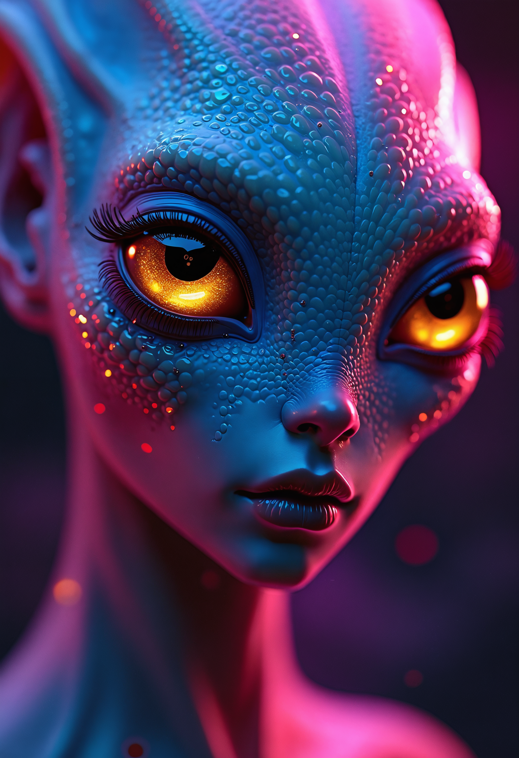 Otherworldly portrait merging human and alien features, bathed in vibrant neon lights. Hyper-detailed skin texture with an iridescent, almost metallic sheen. Mesmerizing eyes with multi-colored irises, reflecting a spectrum from electric blue to molten gold. Dramatic makeup with bold, sweeping lines in fluorescent hues. Facial features framed by a circular halo of shimmering, rainbow-colored particles. Sleek, biomechanical suit with intricate patterns and reflective surfaces. Background fading from deep space black to swirling nebula purples and pinks. Sharp contrasts between light and shadow, emphasizing the otherworldly glow. Photorealistic rendering with surreal, sci-fi elements. Captivating blend of beauty and alien mystique, highlighted by a dazzling array of colors from across the visible spectrum.