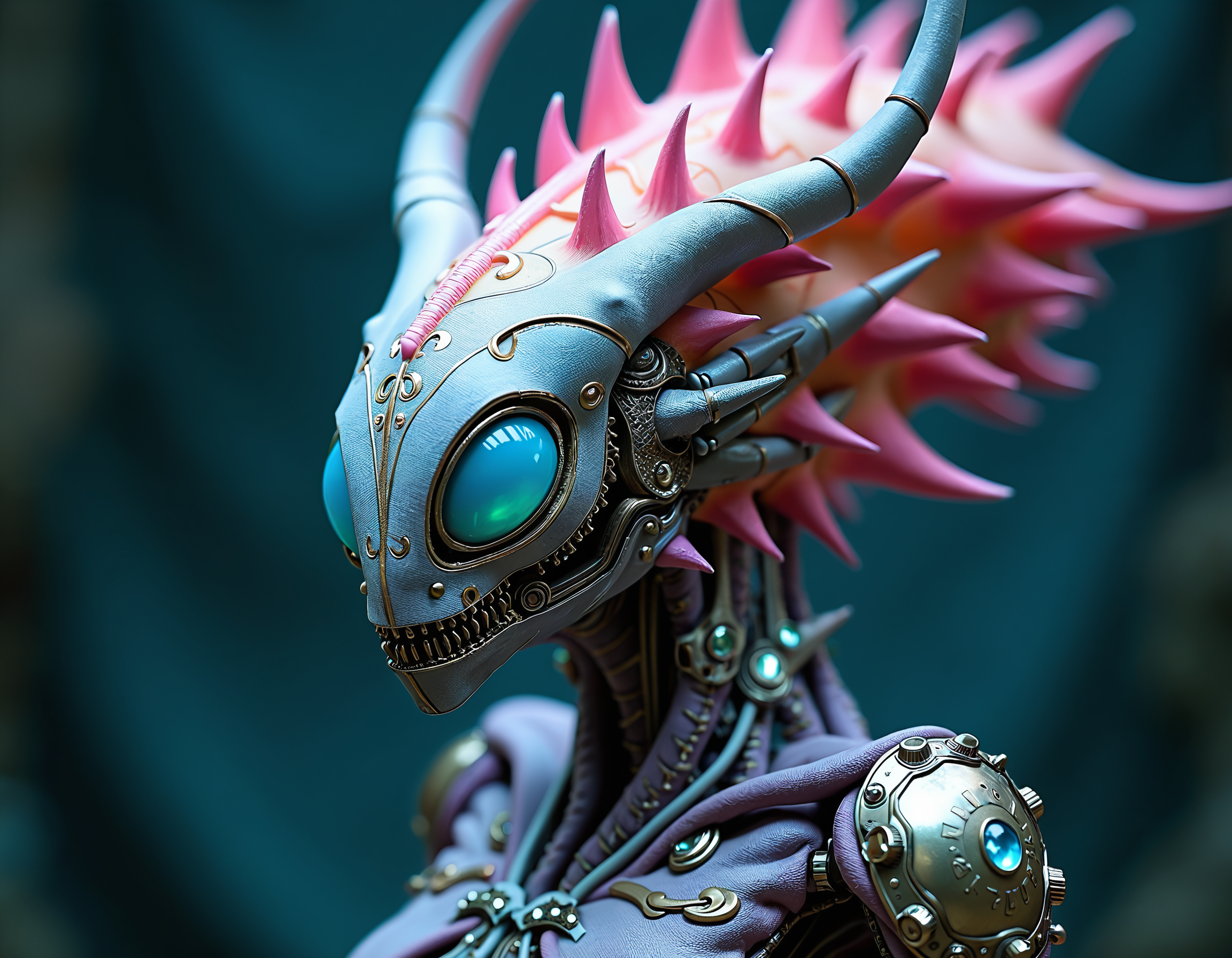 Alien hybrid creature, bioluminescent skin. Elongated head, ornate horns. Piercing blue eyes, slit pupils. Intricate exoskeleton, pink spikes. Metallic accents, jewel-like embellishments. Ethereal glow, otherworldly presence. Hyper-detailed textures. Blended organic and mechanical features. Surreal sci-fi aesthetic