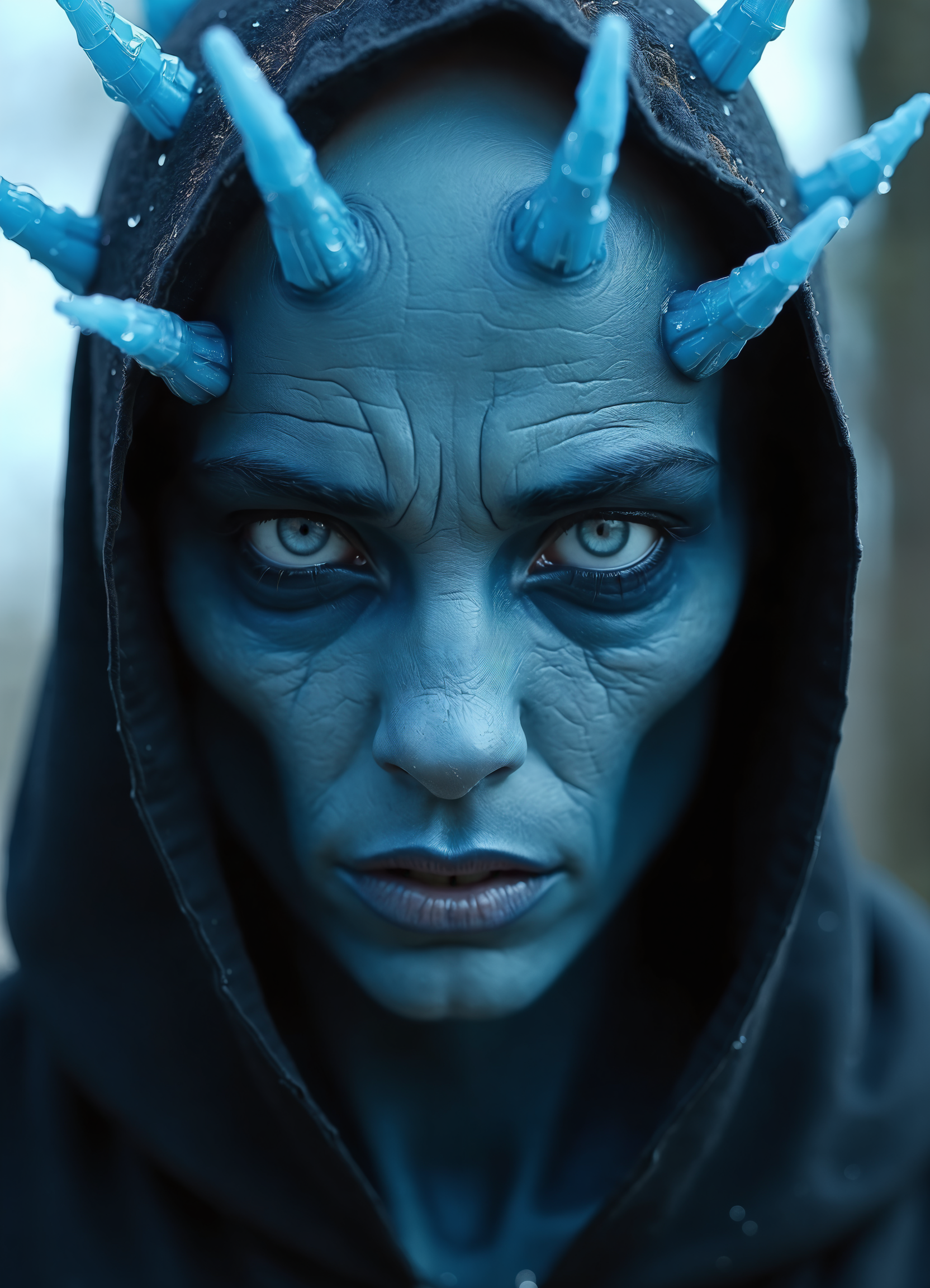 Image is a highly detailed, close-up portrait of a person with a striking, otherworldly appearance. The subject has blue skin with deep wrinkles and pronounced facial features, including a prominent brow and high cheekbones. Their eyes are a piercing, icy blue, and they have a bald head adorned with glowing blue spikes that resemble icicles. The person is wearing a black hooded garment that frames their face, adding to the dramatic and intense look. The background is blurred, focusing attention on the subject's unique and eerie visage.