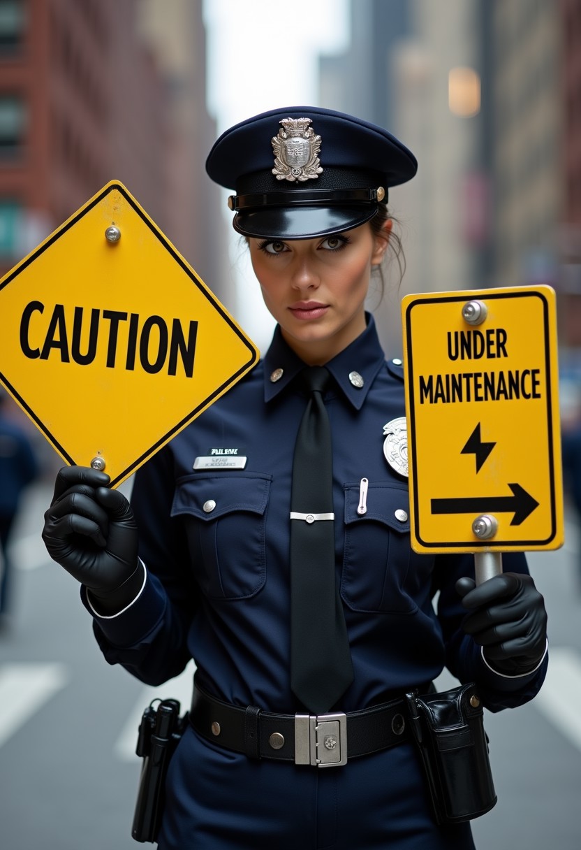 A realistic, cinematic, photograph of a pretty New York City police woman facing the camera. She is holding up one yellow sign that says "Caution". She is holding a second yellow sign that says "Under Maintenance".