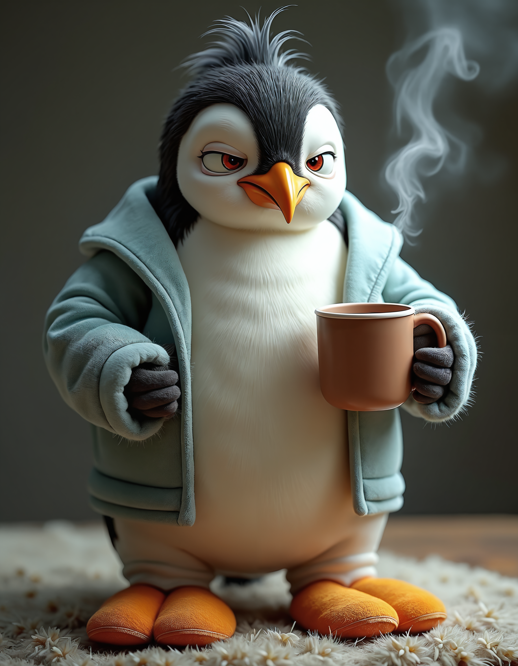 Grumpy anthropomorphic penguin, bedhead, slightly ruffled feathers. Wearing rumpled pajamas, oversized slippers. Holding steaming coffee mug, half-closed eyes. beak, drowsy expression. Hyper-realistic 3D render, soft lighting, gray background. Comical morning scene, cartoon style with photorealistic textures