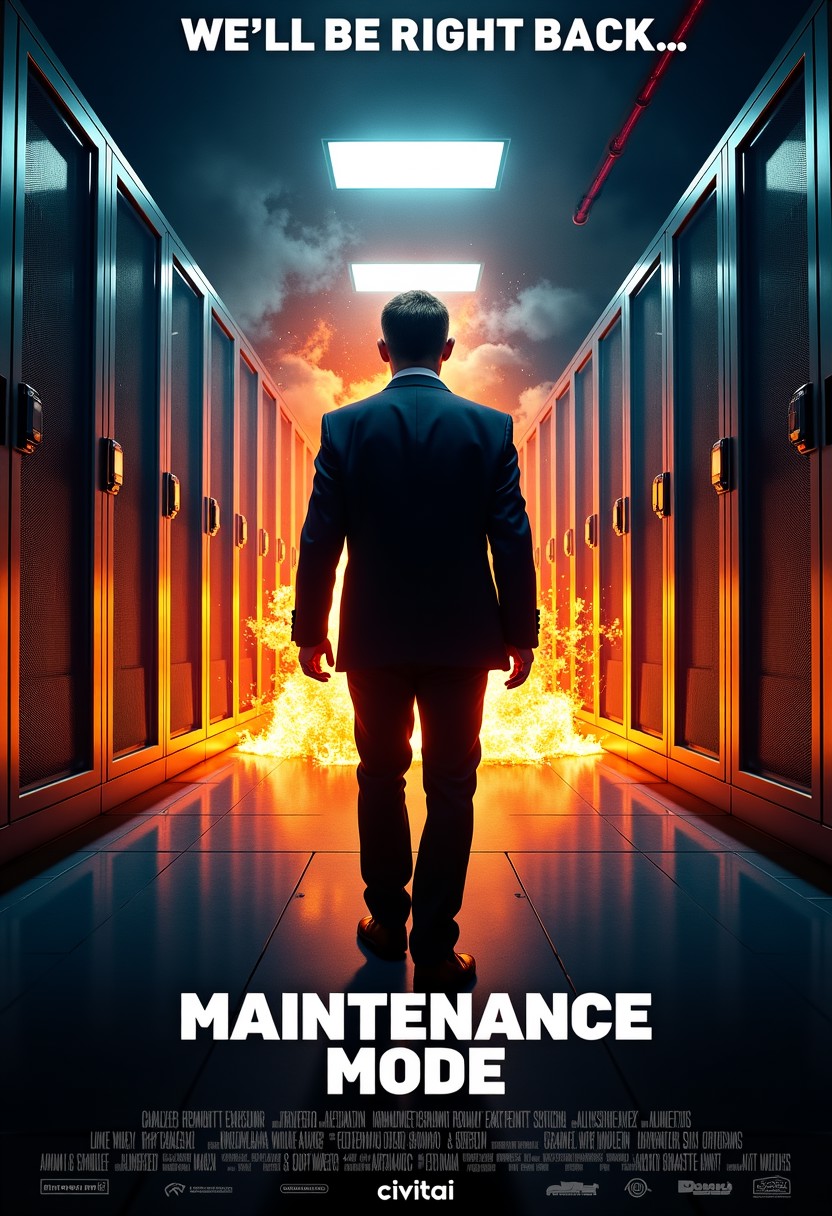 thrilling action movie poster, a realistic secret agent in a suit, server room exploding in background, cool title card with the text "Maintenance Mode", watermark at the bottom with the text "civitai.com", tag line at the top with the text "We'll be right back..."