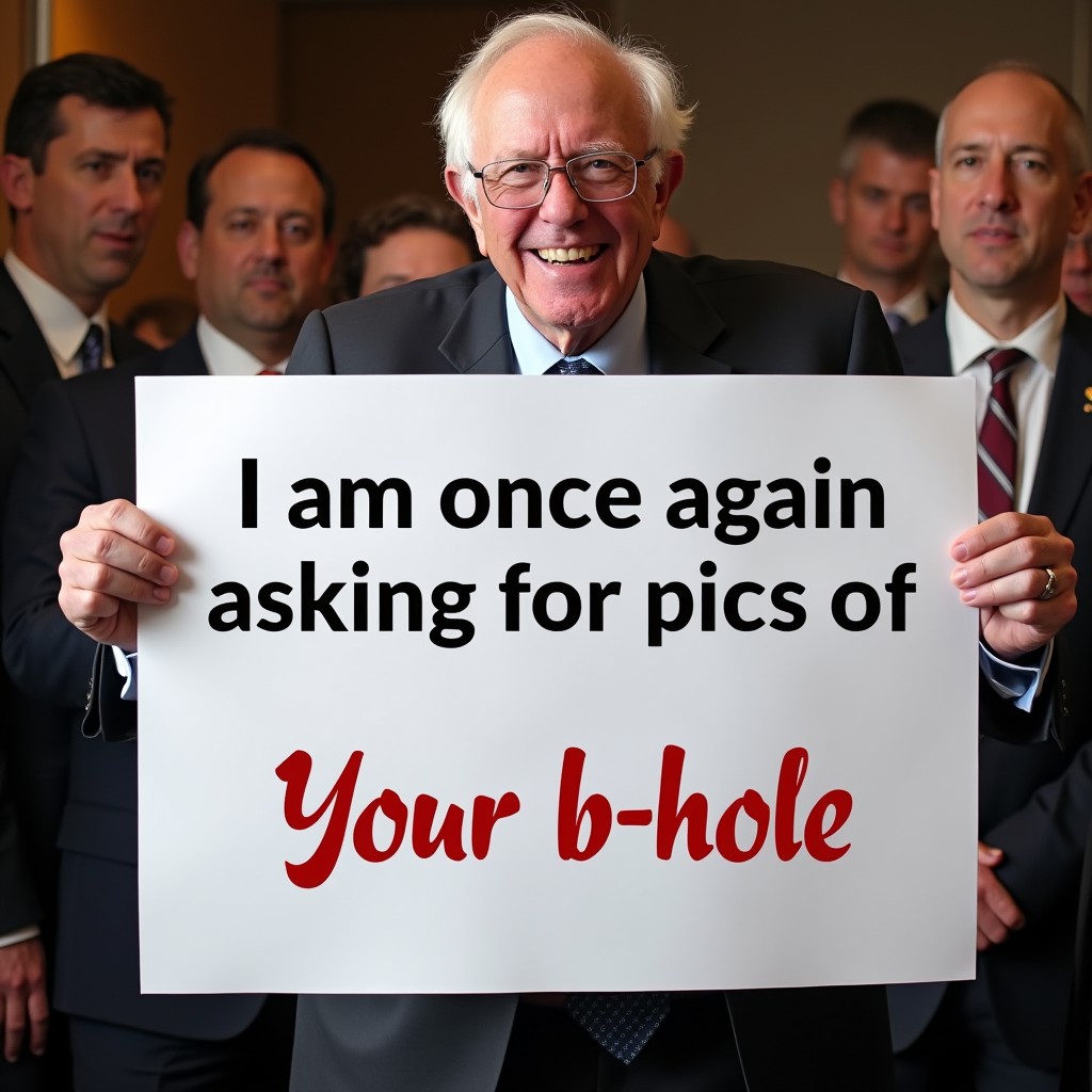 Photo of Bernie Sanders, holding a large poster with the words "I am once again asking for pics of your b-hole"
