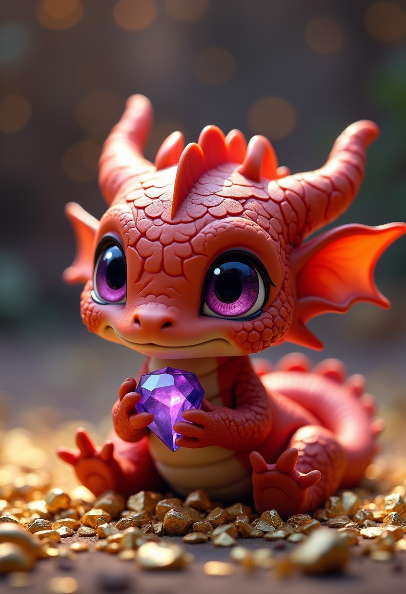 a baby dragon lying on a small pile of gold, holding a shining jewel in its clan, detailed scales, cute, fantasy setting, magical background, red scales, big purple eyes, Photorealistic, Highly detailed, masterpiece, 4k, high resulution