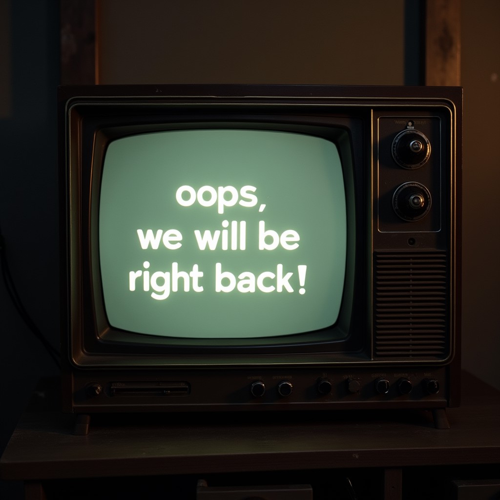 old timey cathode-ray tube monitor showing an intermission screen that says "oops - we will be right back!"
