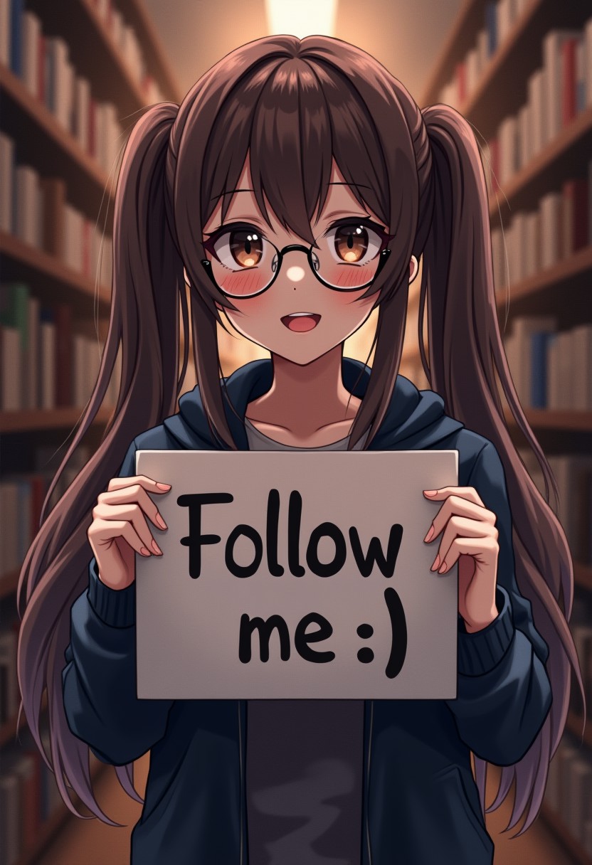 1girl, anime girl holding a sign with text "Follow me :)", solo, long hair, expressive eyes, dark eyeshadow, detailed skin, detailed face, perfect face, closed eyes, twintails, smile, brown hair, glasses, casual clothes, library, illustration, perfect composition, dramatic lighting, film grain, highly dramatic background, cinematic film still, very aesthetic, (intricate details, (incredibly detailed), high detail, ultra-detailed), (hyperdetailed), (soft focus:1.1), absurdres, (hires textures), (4k), (masterpiece, best quality)