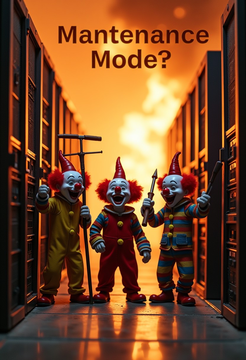 photograph of a bumbling group of little people clowns holding random tools that are laughing hysterically while trying to fix a burning and exploding server room. at the top of the image it says "Maintenance Mode?" in fiery letters.