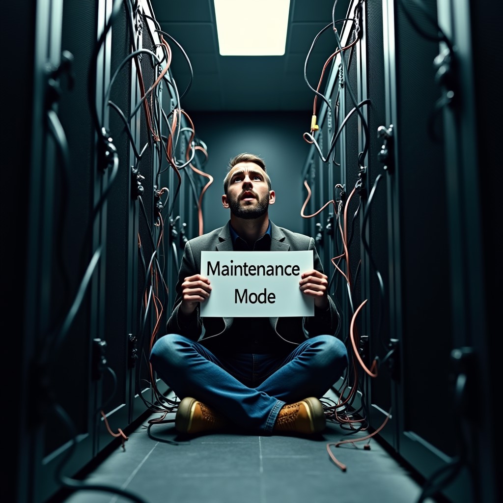 A server room, in the center a man sitting with a desperate face and tangled in thousands of cables, the man holds a sign in his hands that says "Maintenance Mode"