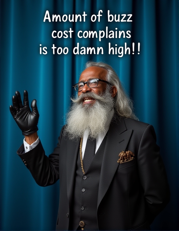 floating text at the top of the image "Amount of buzz cost complaints is too damn high!" wrtten with huge white letters , old african man with gray long hair and fancy mustache and beard wearing glasses and classy suit and black gloves, his right hand is raised, he's irritated, blue curtain as background