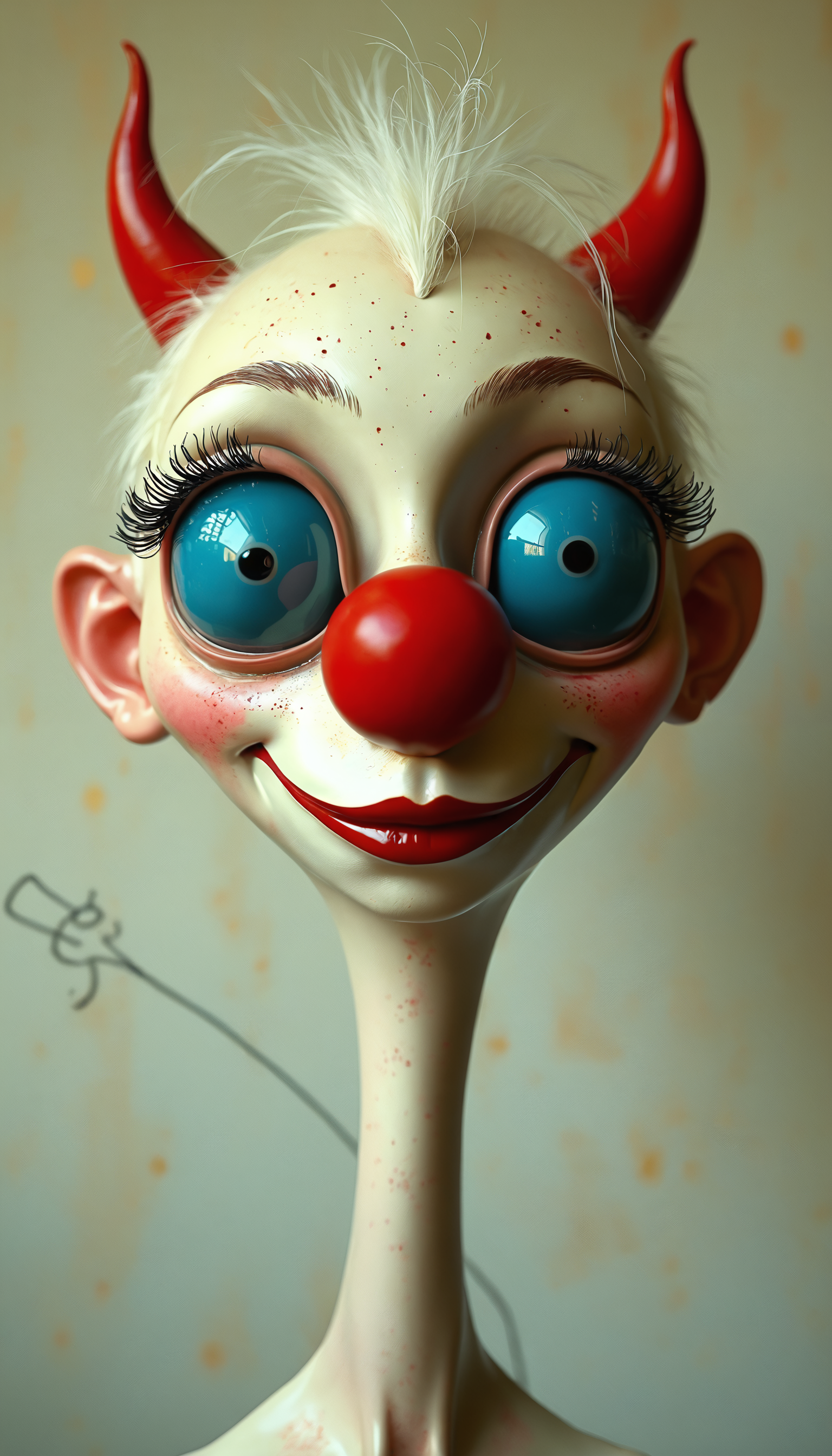 Hyper-detailed close-up of a surreal, elongated face. Enormous blue eyes dominate the upper half, glistening with an almost liquid quality. Impossibly long eyelashes curl outward. Pale skin with a scattering of freckles across cheeks and nose. Bright red, bulbous clown nose sits incongruously on the face. Full, pouty lips painted a vibrant red, slightly pursed. Wispy, platinum blonde hair stands on end, defying gravity. Two small, bright red horns or buns peek out from the hairline. Impossibly long, slender neck stretches downward, reminiscent of Modigliani's portraits. Skin texture is eerily lifelike, with visible pores and fine hairs. Background is a muted, creamy color with faint, sketchy lines suggesting unfinished thoughts or dreams. Lighting is soft and diffuse, giving the face an otherworldly glow. Overall effect blends childlike whimsy with unsettling realism, creating a dreamlike, semi-grotesque portrait that straddles the line between human and caricature.