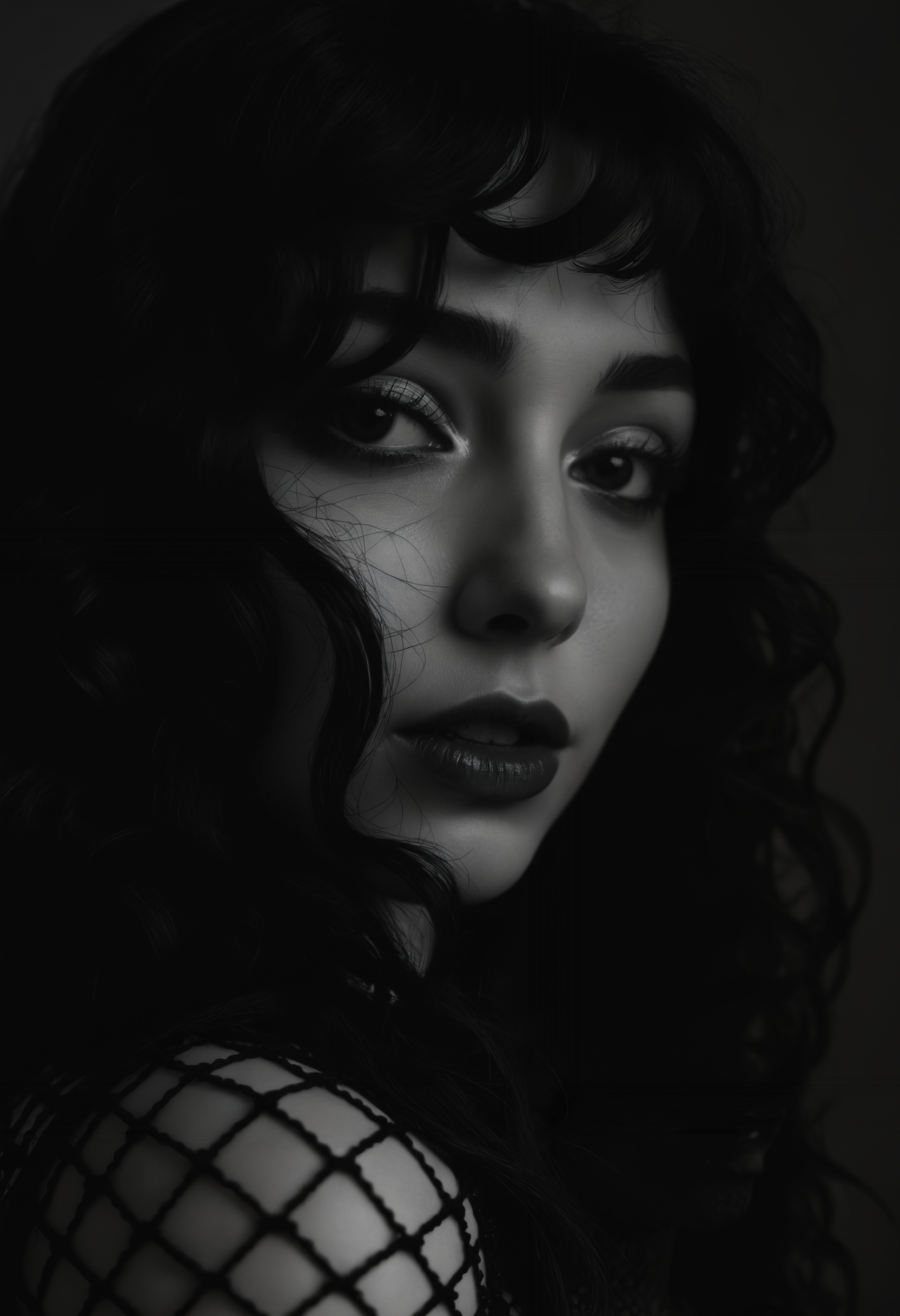 a black and white photo of a woman's face, featured on cgsociety, art photography, fishnet clothes, submissive, dark. no text, bottom shot, curvy, kiss, dark aesthetics, full body close-up shot, 8k fine art photography, lattice, a close-up, 2 b, wrapped in black, 2b, petite <lora:add-detail-xl:0.5> <lora:xl_more_art-full_v1:0.5>