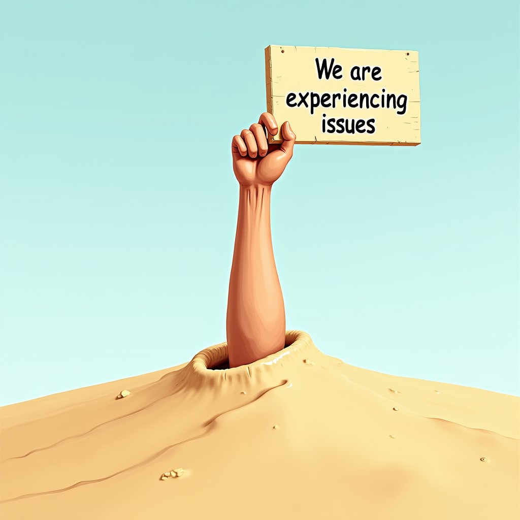 highly detailed illustration of an arm stretched to the sky, emerging from quicksand, holding a sign saying: "We are experiencing issues"