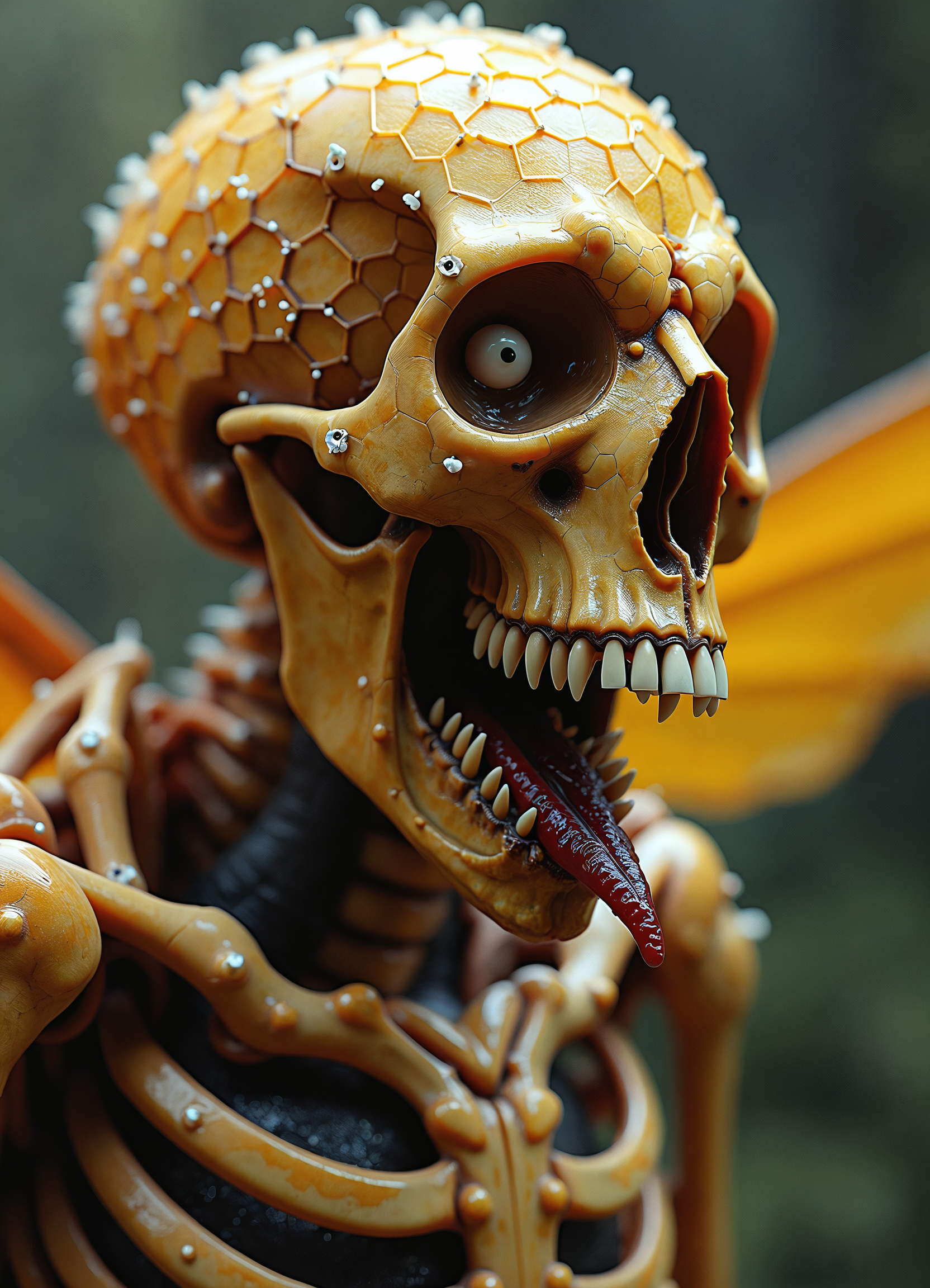 Hyper-realistic skeletal bee hybrid, honeycomb skull cap. Grotesque elongated jaw, screaming expression. Milky white eyes, sunken sockets. Intricate bone structure merging with hexagonal patterns. Exposed muscle fibers and tendons on neck. Bee wings emerging from shoulders. Fungal growths resembling honeycomb on torso. Earthy tones, warm amber highlights. Blurred natural background. Macro detail on textures. Unsettling fusion of organic elements. Photorealistic rendering, dramatic lighting. Horror surrealism, body horror aesthetic