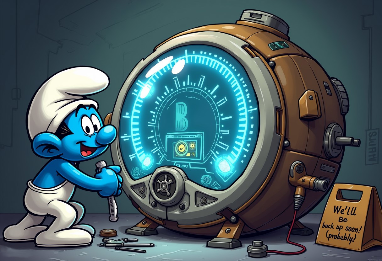 score_9, score_8_up, score_7_up, BREAK Handy Smurf working on a futuristic looking machine with some tools, a toolbox beside him. A sign should read "We'll be back up soon! (probably)"