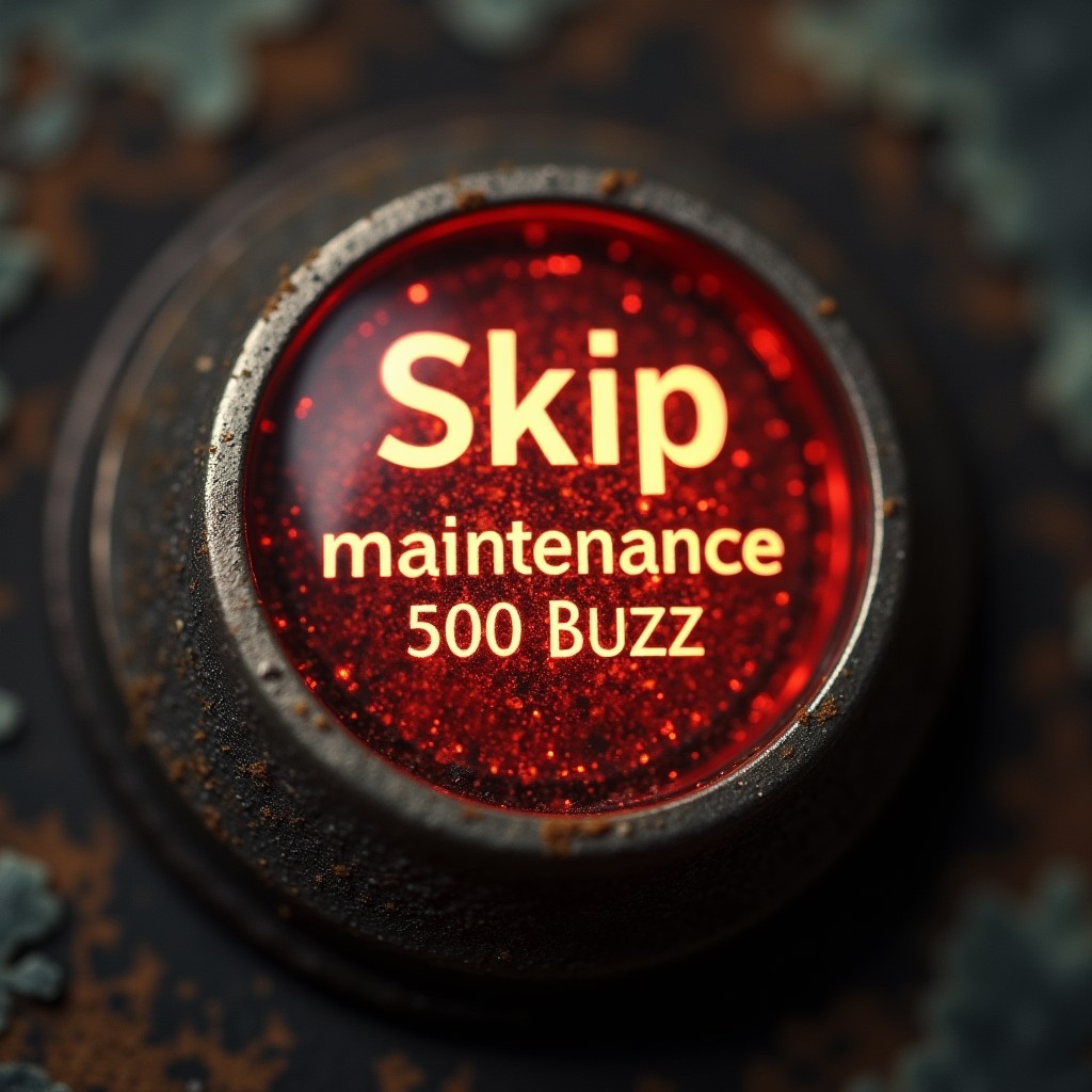 squire button with inscription text "Skip maintenance for 500 Buzz". burning computer