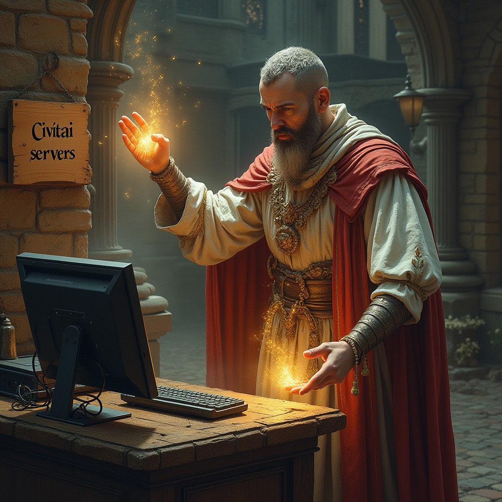Medieval fantasy cleric casting healing miracles on civitai computers, a wooden sign labeled "Civitai servers" is above the computers, the background is a victorian house