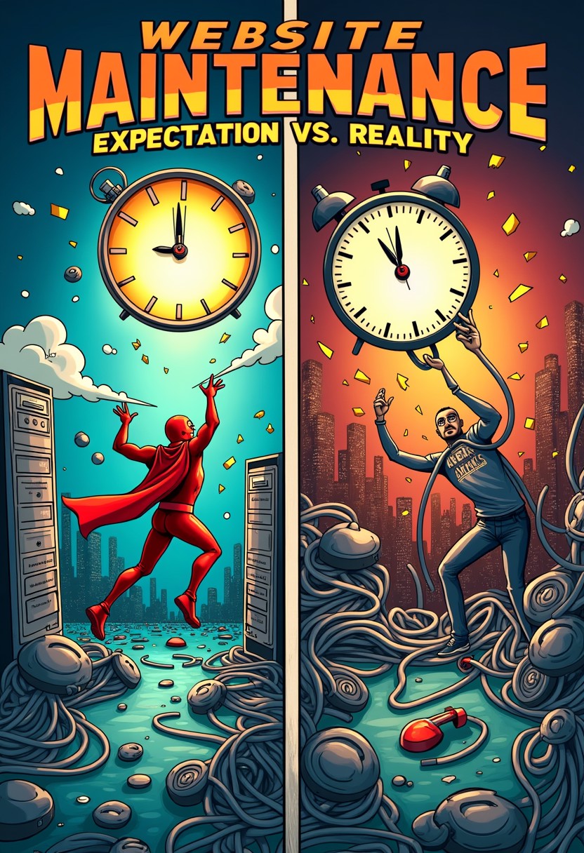 Image macro meme, single panel format, comic book pop art style, text overlay "WEBSITE MAINTENANCE: EXPECTATION VS. REALITY", split-screen composition: Left side (Expectation): Superhero-like figure labeled "Dev Team" effortlessly juggling server racks Smooth, futuristic UI elements being seamlessly integrated Clock showing quick 5-minute timeframe Shiny, new website emerging from a glowing portal Right side (Reality): Frazzled developer drowning in a sea of tangled cables and error messages Comically large "Undo" button being repeatedly smashed Coffee spills forming puddles of Java (pun intended) Clock melting Dali-style, showing indeterminate time Old website on life support, connected to IV drip of code.