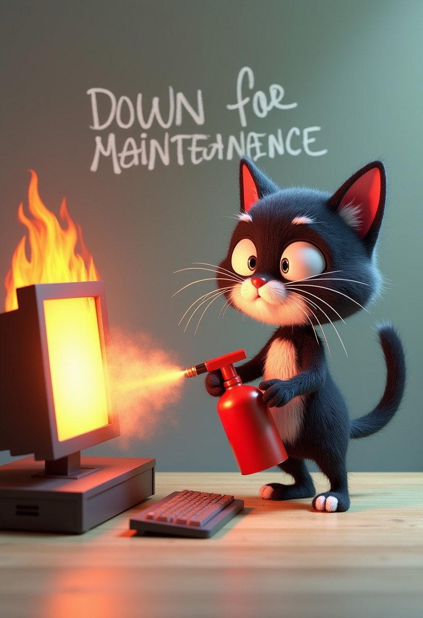 3d rendered cartoon far black and white colored cat, spraying computer with fire extinguisher, computer on fire, words "down for maintenance" in a circle around the image,