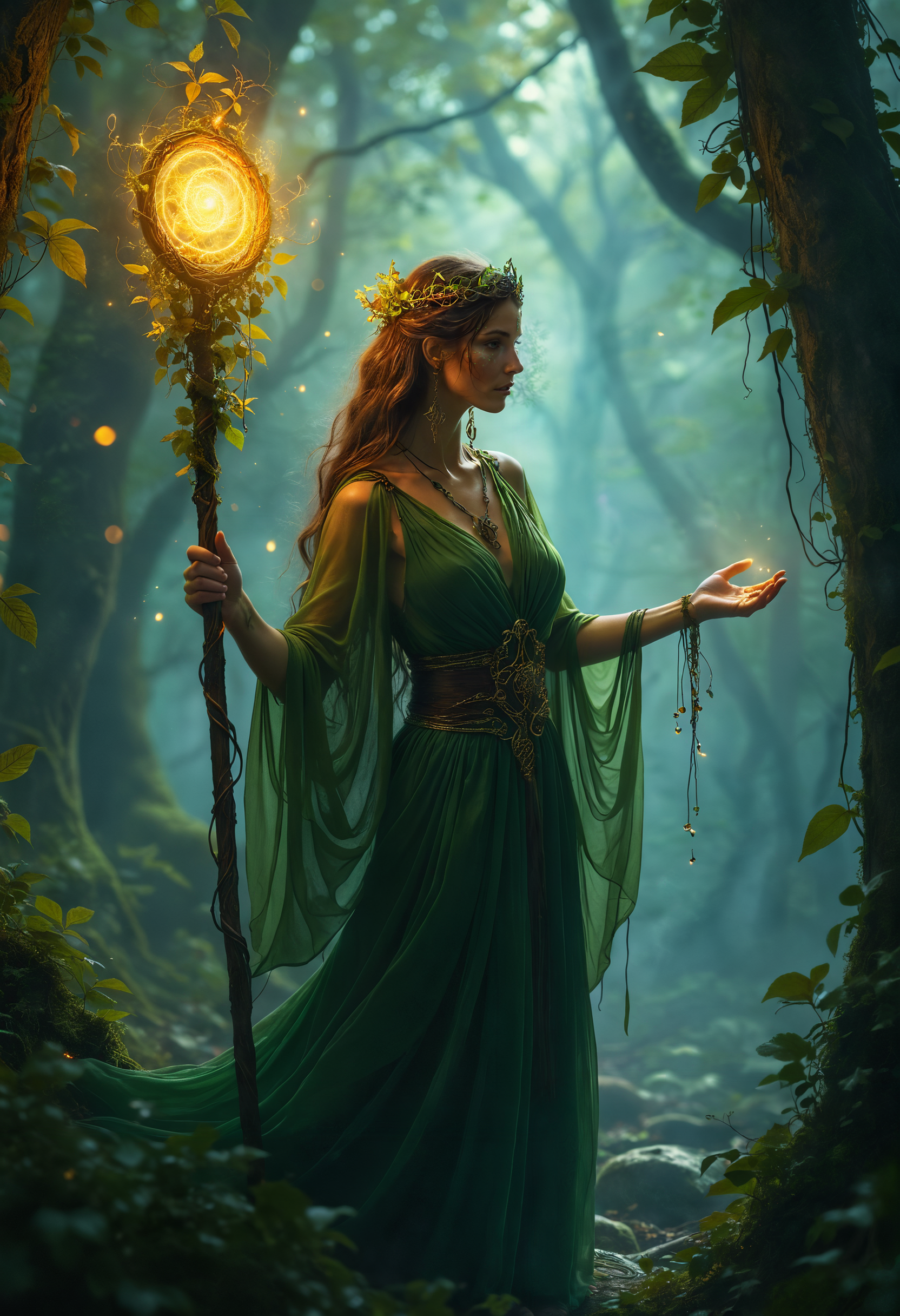A very detailed photograph of a beautiful female druid who channels the forces of nature deep within a mystical forest. Leaves and vines swirl around her as she communes with ancient spirits, her intricate staff glowing with ethereal energy. The balance of life and magic hangs in the air. Vibrant energy flows around and enlightens the misty night. <lora:add-detail-xl:0.5> <lora:xl_more_art-full_v1:0.5>