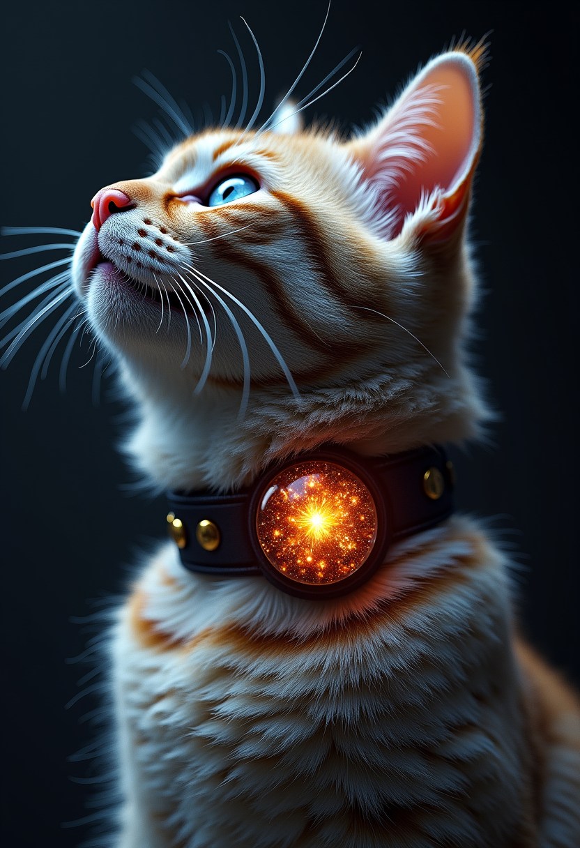 Detailed, masterpiece, professional, bold colors, awe inspiring, photography inspired by Jeremy Mann, 30mm shot, action scene, HDR, cat, intricately detailed collar with marble displaying a galaxy trapped within, mesmerizing, realistic fur texture