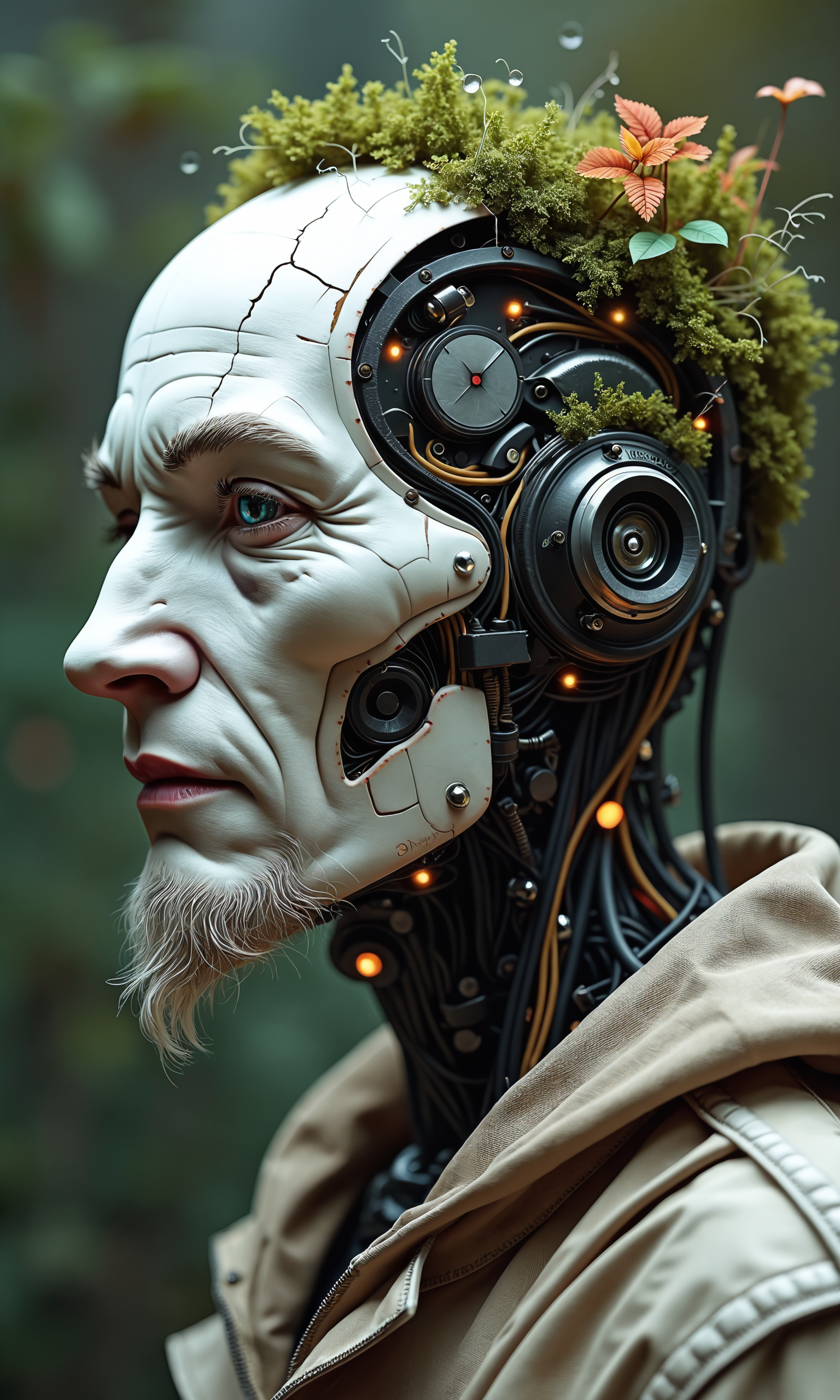Hyper-detailed cyborg head, white porcelain face, intricate circuitry patterns. Mechanical components visible, gears and wires exposed. Vibrant green eyes. Miniature ecosystem growing on scalp, tiny trees and moss. Blend of organic and synthetic textures. Weathered metal, rust spots. Cables and pipes emerge from neck. Photorealistic 3D render, sharp focus on subject