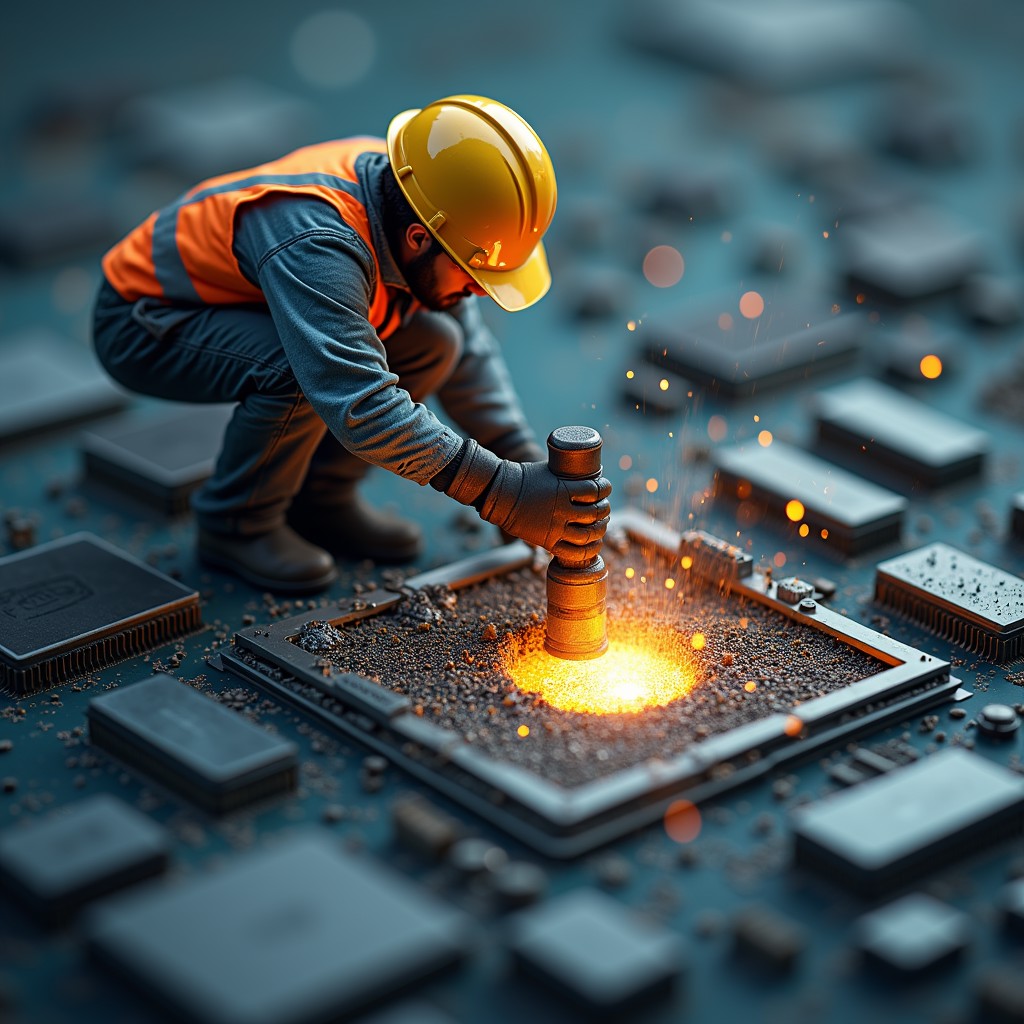 Create an image of a mirco worker in a hard hat digging into a CPU with a demolition jack hammer and putting a hole in the CPU