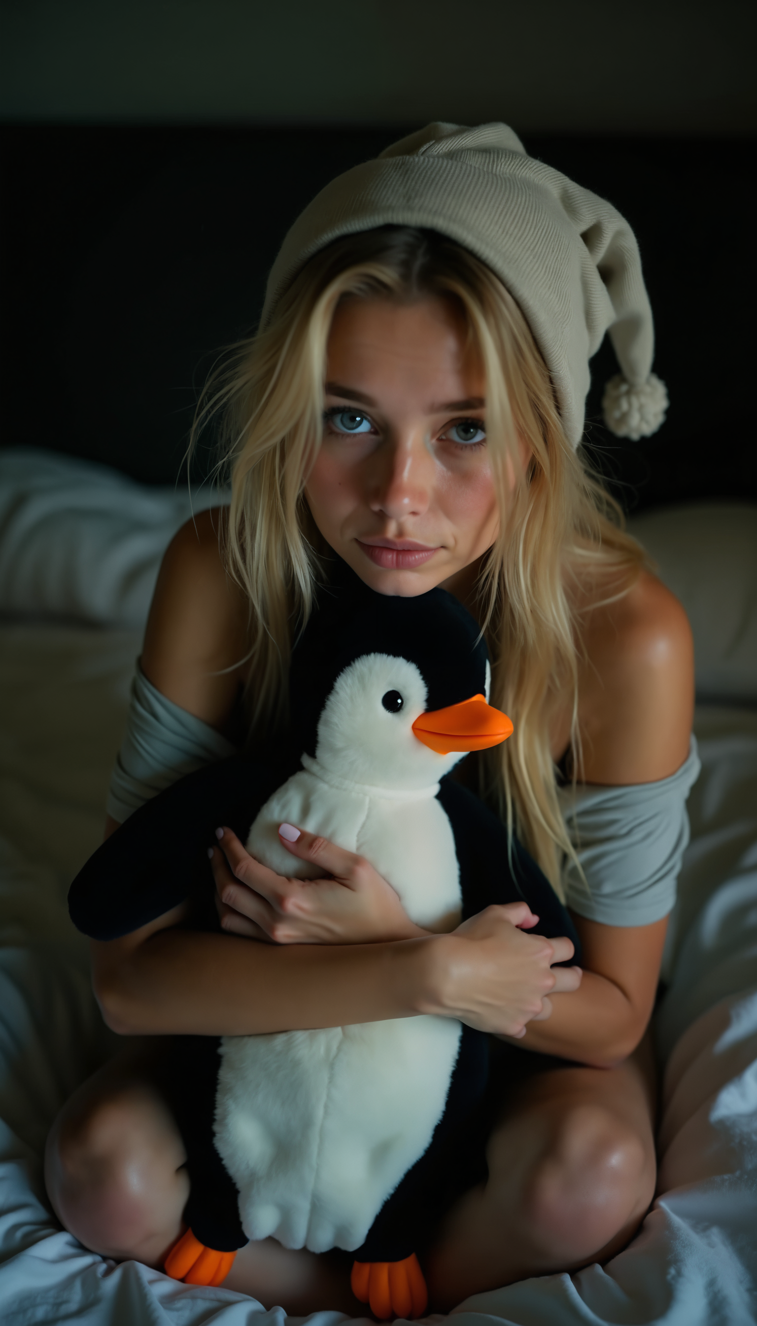 Blonde hair, (blue eyes:1.1), messy hair, long hair, nightcap, off shoulder, blank expression, bedroom, 21 years old, girl, best quality, holding stuffed toy, stuffed black and white penguin, object hug, masterpiece, pajamas, subsurface scattering, ultra hd, 4k, high def, Photorealistic, Hyperrealistic, Hyper detailed, analog style, realistic, masterpiece, best quality, ultra realistic, 8k, Intricate, High Detail, film photography, soft lighting, heavy shadow
