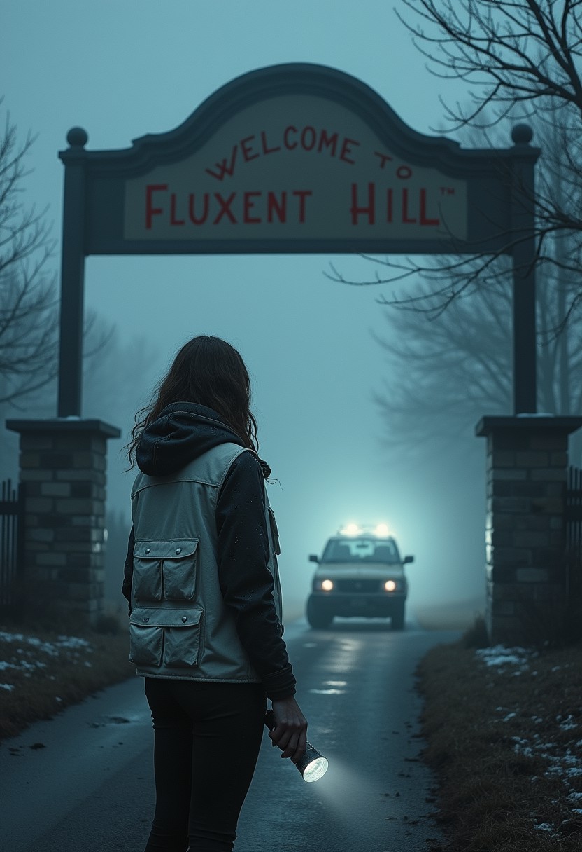 female in white multi-pocket vest standing near town entrance, she holding flashlight, black snow falling down, (entrance town sign says "Welcome to Fluxent Hill"), fog and ash, horror atmosphere, broken car, broken road,