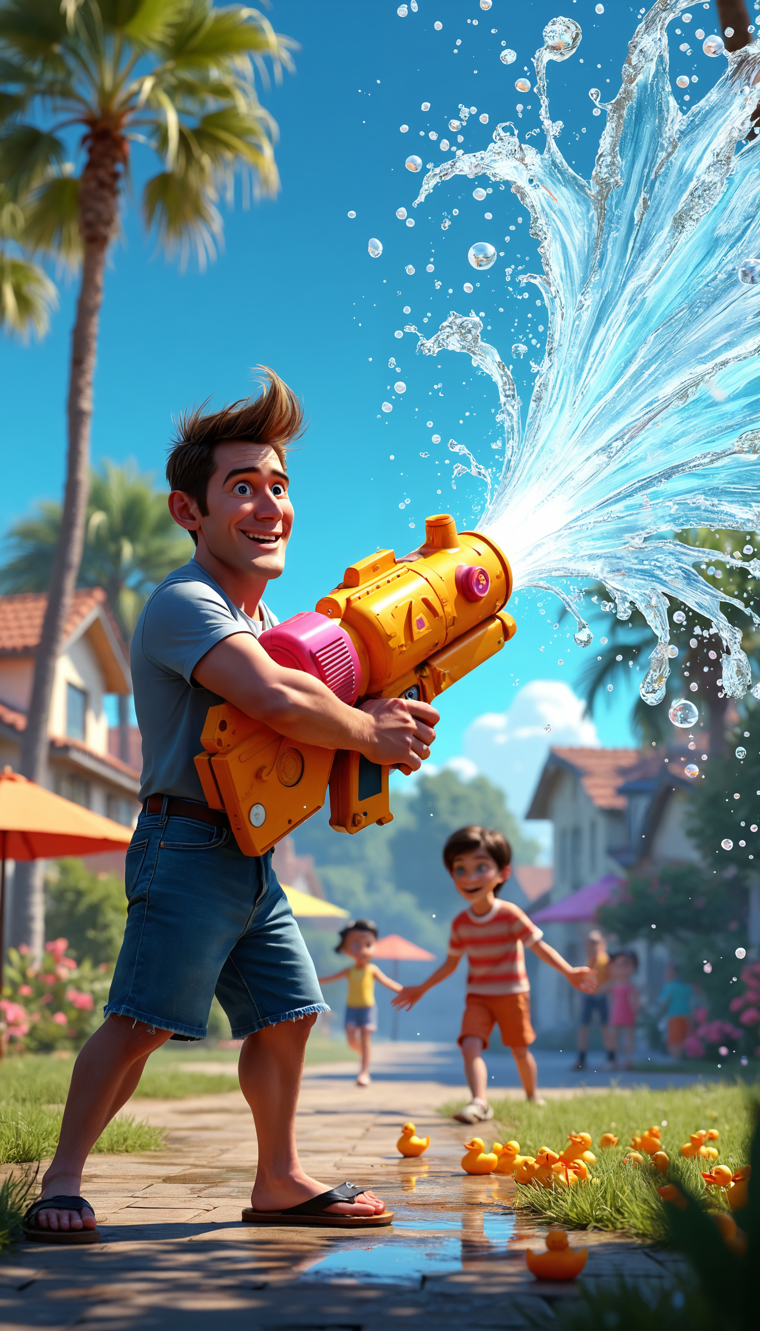 suburban backyard bursting with vibrant colors. In the foreground, an enthusiastic dad with a cartoonishly exaggerated grin stands proudly wielding a comically oversized, neon-colored water gun. His stance is heroic, legs apart, one eye squinted as he takes aim. The water gun is almost as big as he is, covered in wacky dials, pressure gauges, and blinking lights.