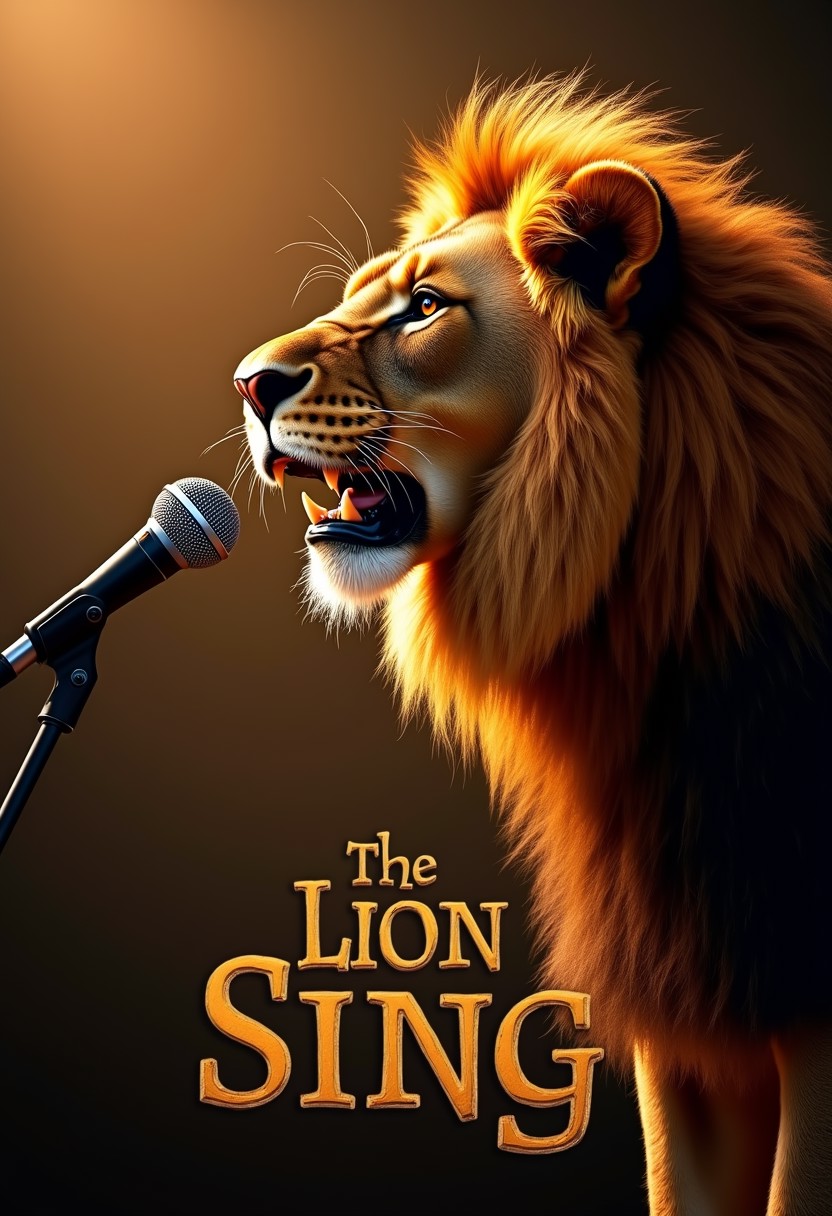 cinematic photo, a text title movie poster "The Lion Sing", a lion singing into a microphone, the lion king style, highly detailed, parody movie poster, a digital movie poster illustration