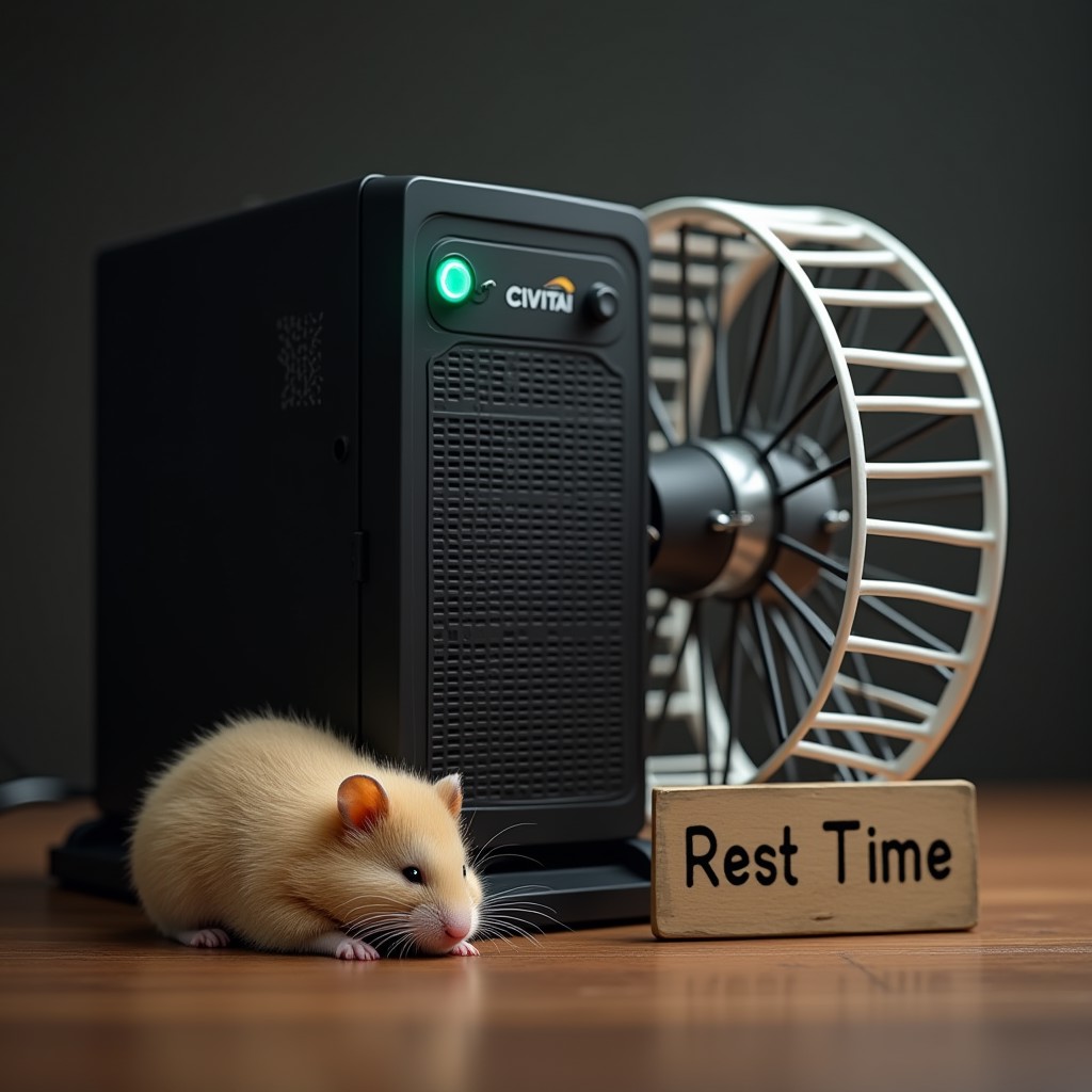 (((A hyper-realistic image of a server connected to a hamster wheel, hamster wheel for exercise, hamster sport wheel))), with a small, fluffy hamster sleeping peacefully beside it. The server has a logo on the front that reads "CIVITAI." A sign next to the server displays the text "Rest Time." The scene is softly lit, emphasizing the connection between the wheel and the server, and highlighting the tranquility of the sleeping hamster
