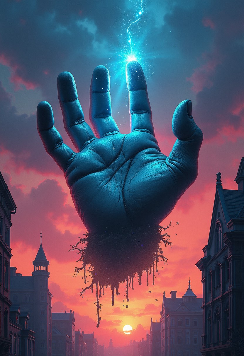 Suspended in the twilight sky, the Hand of Doom enacts the ancient 'As Above, So Below' gesture. Two of its immense fingers point towards the heavens while the others gesture towards the earth, its grey skin and pulsing blue veins becoming a conduit for cosmic energy. The grime under its nails sparkles with stardust, bridging the gap between the celestial and the terrestrial., in the style of the decaying empire of Würstreich, dark magic and grotesque creatures abound, inspired by Sean Aaberg's punk aesthetic, dark fantasy world combines grim landscapes with vibrant, exaggerated colorful art, heroes skirmish monstrous foes in a setting where rebellion, decay, and mysticism intertwine, crafting a unique, immersive vibe