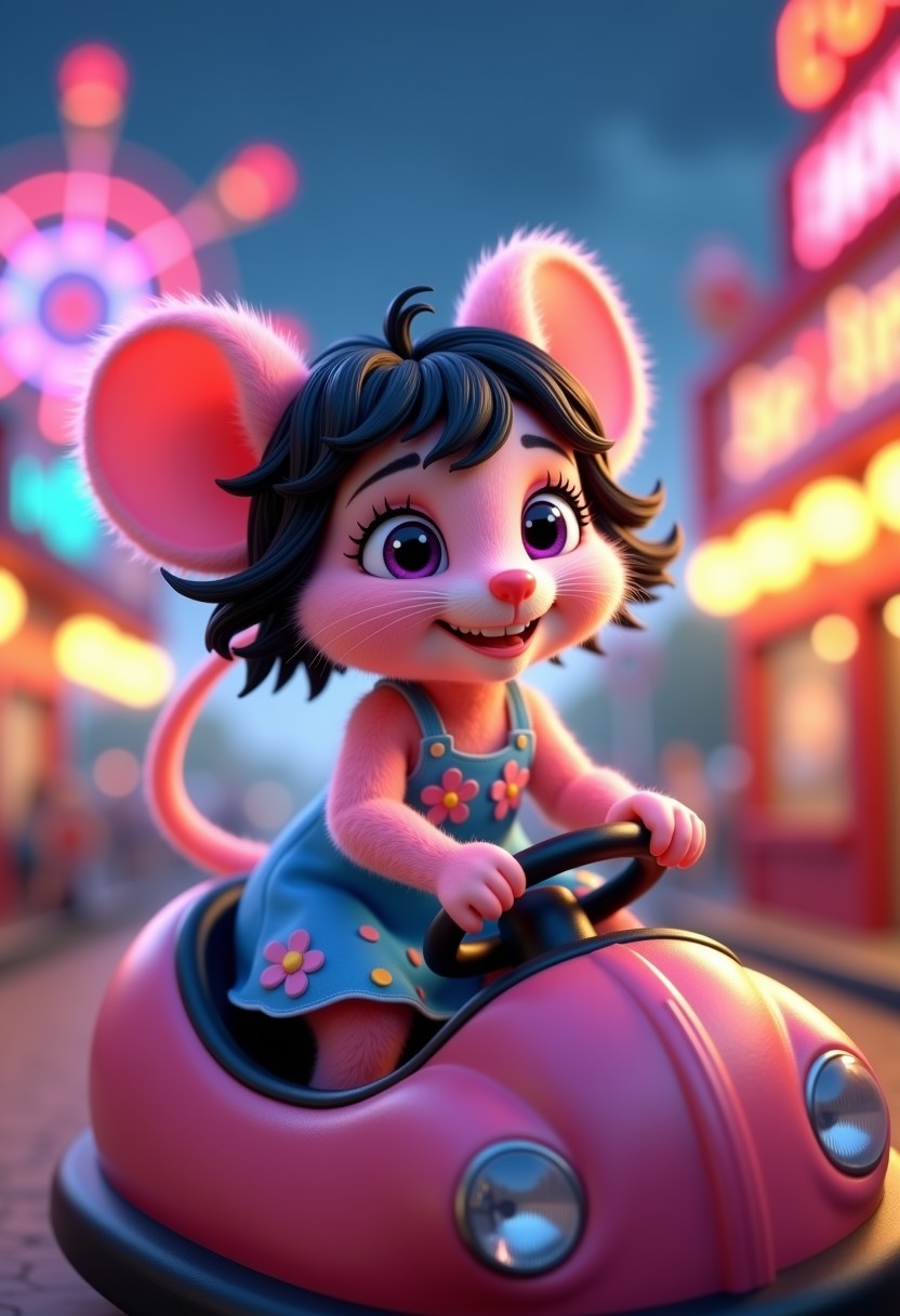 in the style of 3D Pixar animation, featuring an adorable anthropomorphic mouse of short stature with a small round face, she has very fluffy pink fur and big beautiful violet eyes, she has black short wavy hair, she's wearing a flowery blue summer dress, she's riding a bumper car, she's smiling, in the air, at the local county fair, it is nighttime