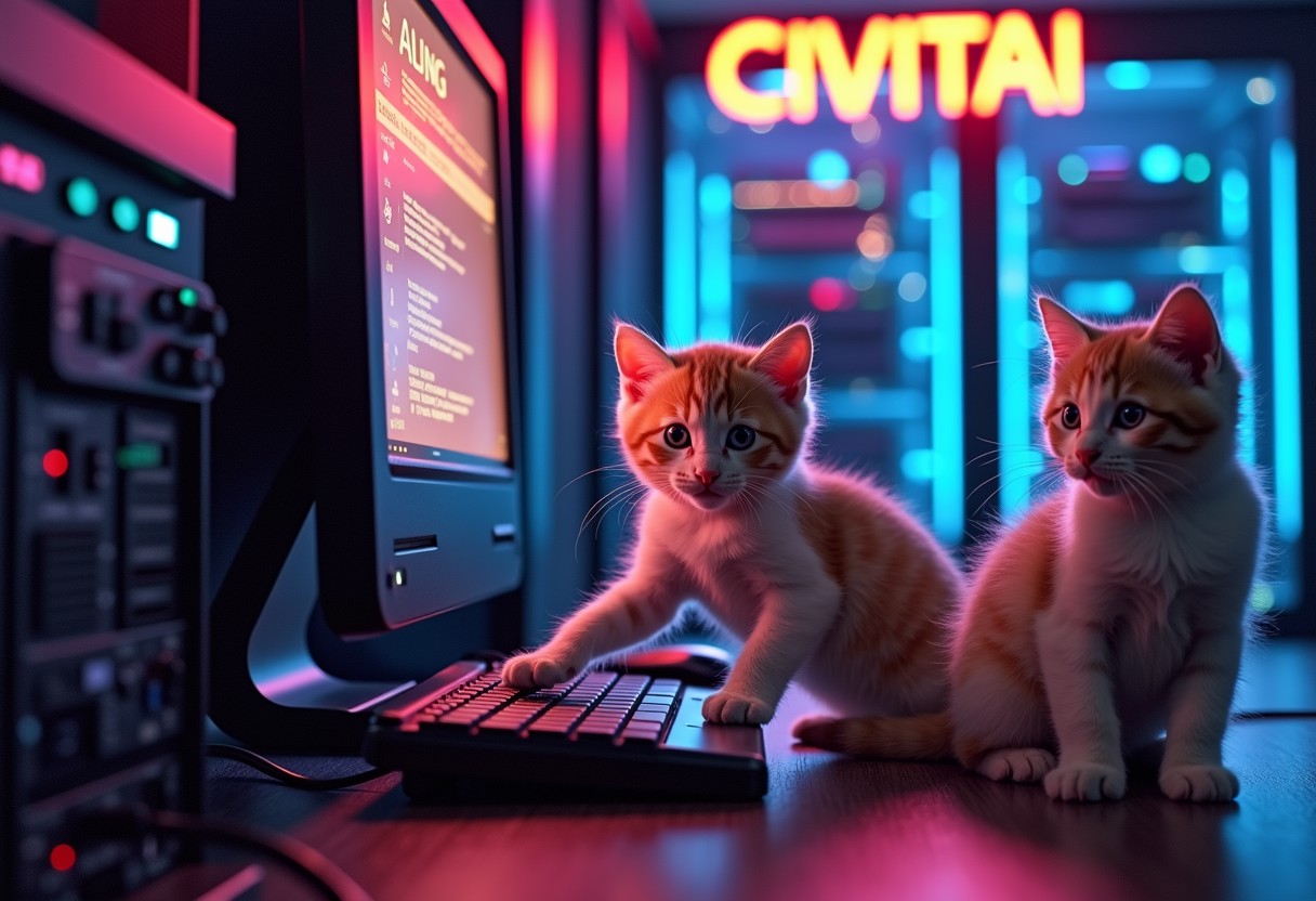 Kittens playing next to a monitor with a failing sign, in a server room. Rainbows and sparkles coming out of the failing servers. A neon sign in the back says "CIVITAI".