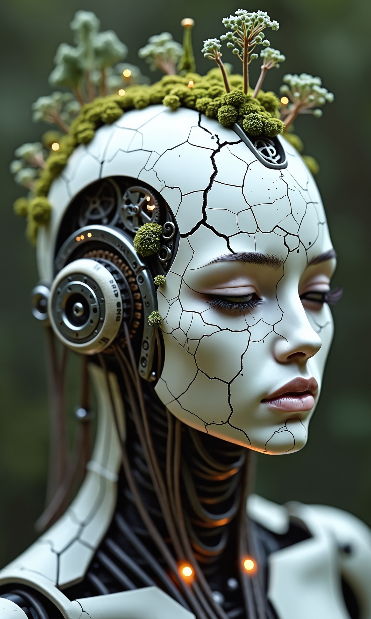 Hyper-detailed cyborg head, white porcelain face, intricate circuitry patterns. Mechanical components visible, gears and wires exposed. Vibrant green eyes. Miniature ecosystem growing on scalp, tiny trees and moss. Blend of organic and synthetic textures. Weathered metal, rust spots. Cables and pipes emerge from neck. Photorealistic 3D render, sharp focus on subject