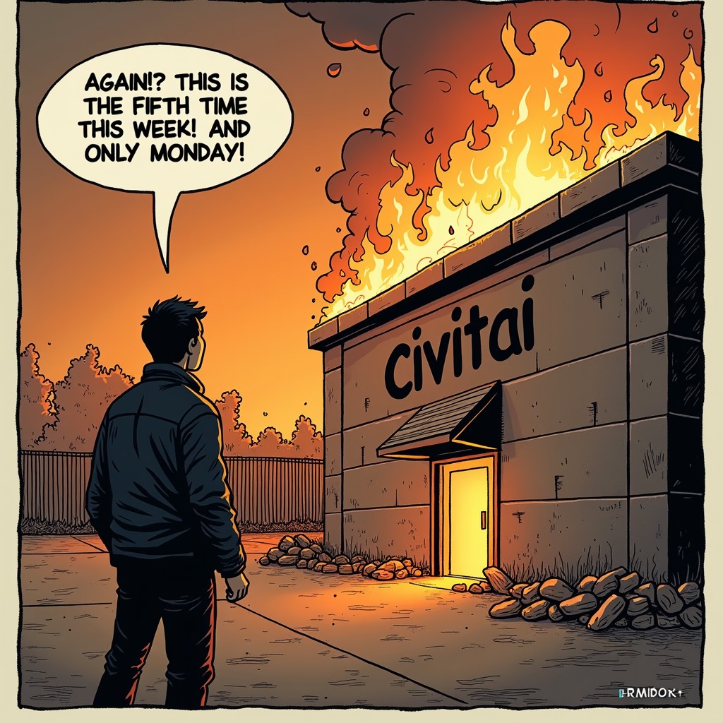 Create an image in the style of a comic about a man looking at a burning "Civitai" building and saying to himself "AGAIN!? THIS IS THE FIFTH TIME THIS WEEK! AND IT'S ONLY MONDAY!"