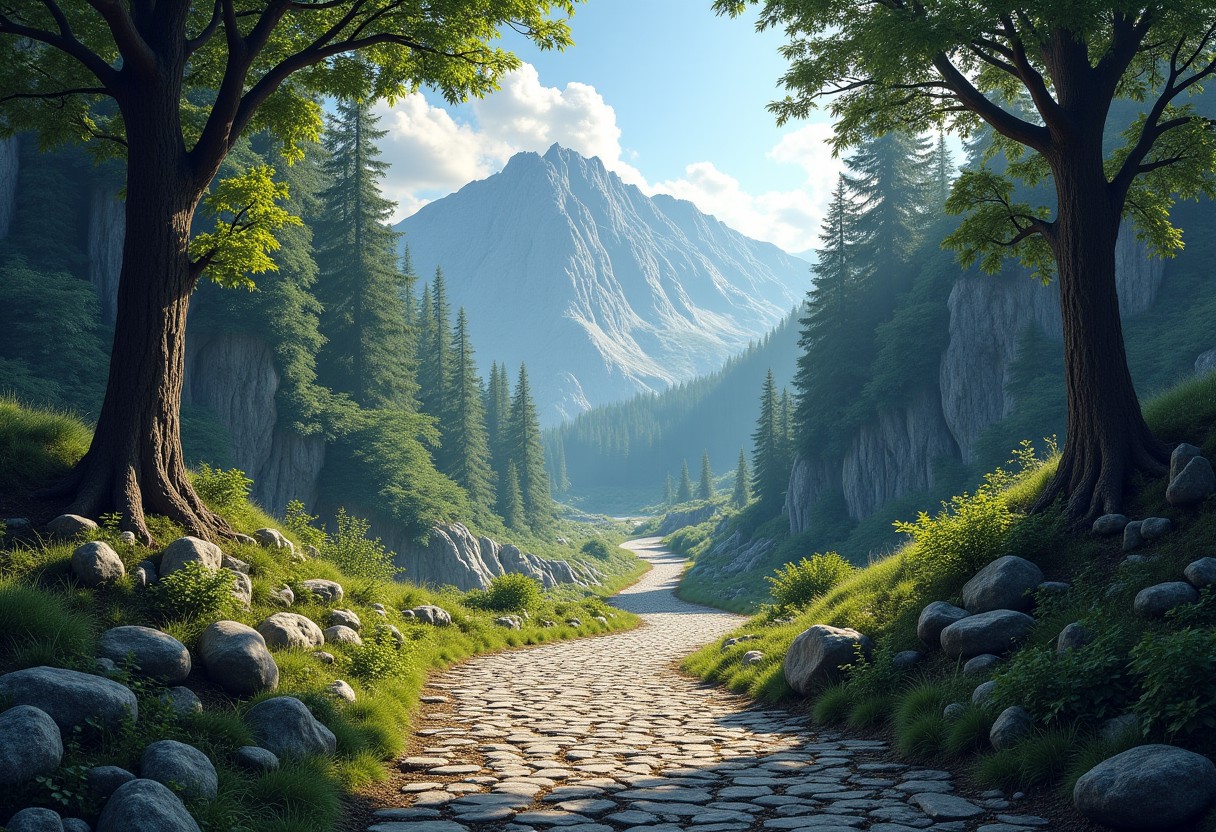Photorealistic Highly detailed fantasy landscape, forest, winding and worn cobblestone road, mountains in background